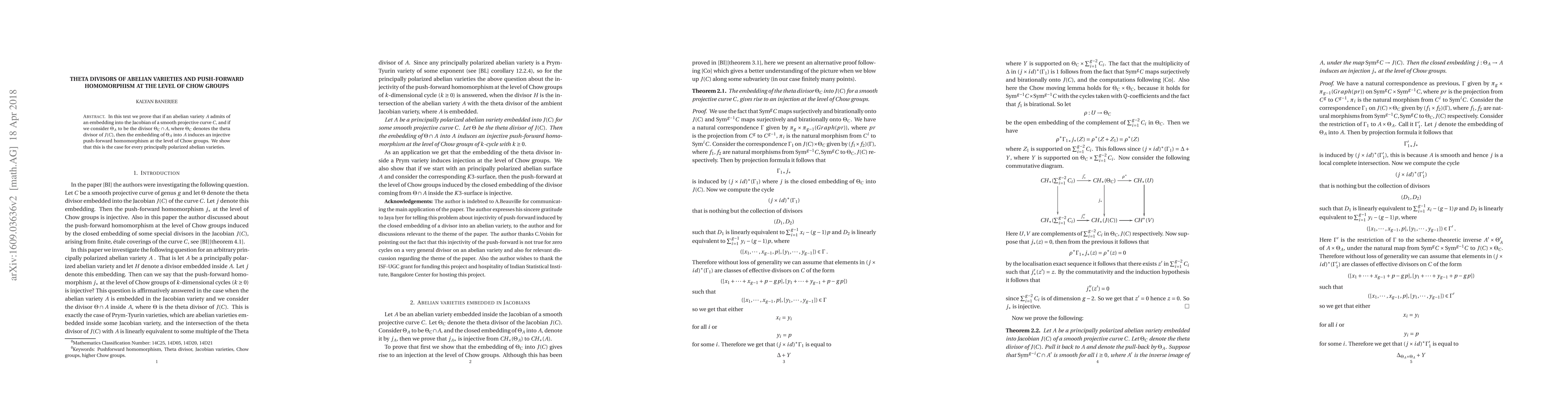 In this text we prove that if an abelian variety $A$ admits of an embedding into the Jacobian of a smooth projective curve $C$, and if we consider $\Th_A$ to be the divisor $\Th_C\cap A$, where $\Th_C$ denotes the theta divisor of $J(C)$, then the embedding of $\Th_A$ into $A$ induces an injective push-forward homomorphism at the level of Chow groups. We show that this is the case for every principally polarized abelian varieties.