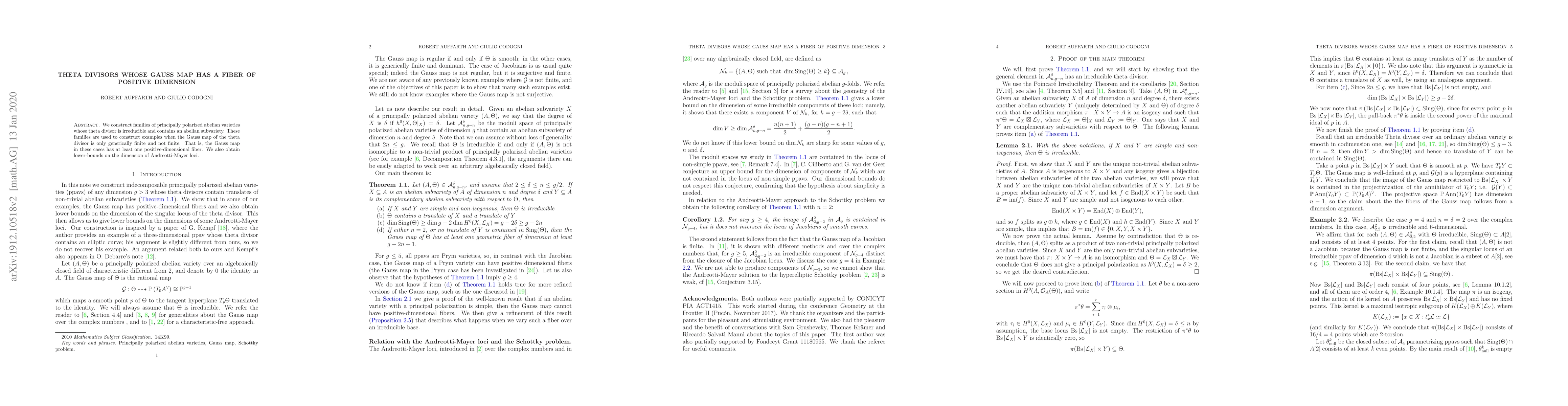 We construct families of principally polarized abelian varieties whose theta divisor is irreducible and contains an abelian subvariety. These families are used to construct examples when the Gauss map of the theta divisor is only generically finite and not finite. That is, the Gauss map in these cases has at least one positive-dimensional fiber. We also obtain lower-bounds on the dimension of Andreotti-Mayer loci.