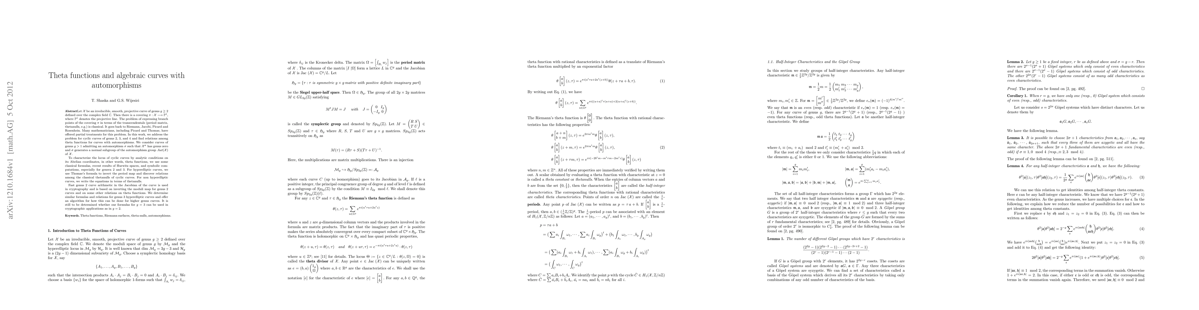 This paper explores the relations among theta functions for algebraic curves with automorphisms, particularly cyclic curves of genus 2, 3, and 4. It uses classical formulas and symbolic computations to characterize the locus of these curves and determine new formulas for genus 3 hyperelliptic curves, potentially extending fast arithmetic used in genus 2 cryptography.