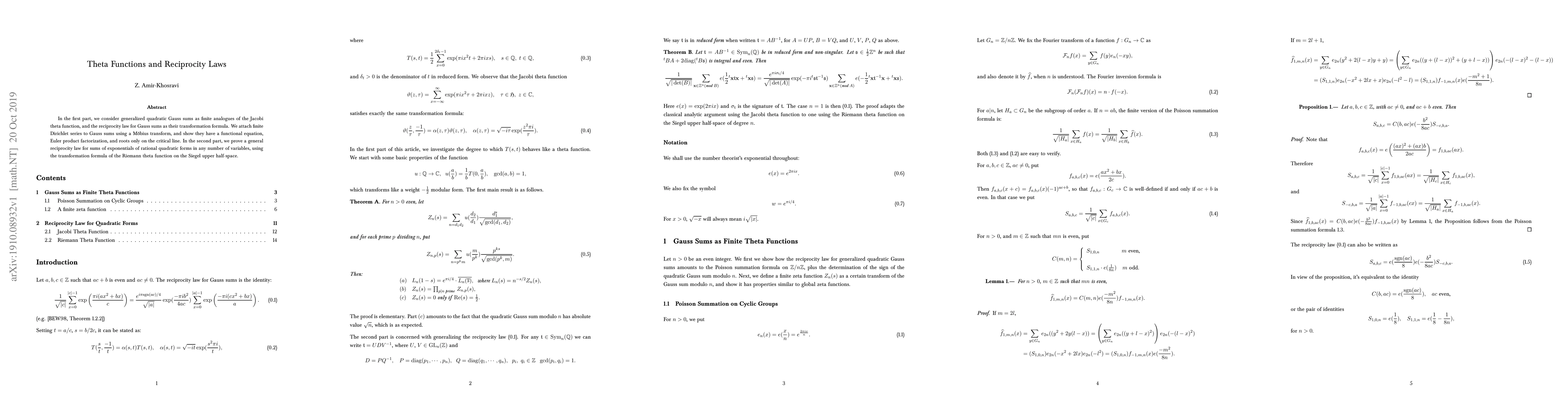 In the first part, we consider generalized quadratic Gauss sums as finite analogues of the Jacobi theta function, and the reciprocity law for Gauss sums as their transformation formula. We attach finite Dirichlet series to Gauss sums using a M\"obius transform, and show they have a functional equation, Euler product factorization, and roots only on the critical line. In the second part, we prove a general reciprocity law for sums of exponentials of rational quadratic forms in any number of variables, using the transformation formula of the Riemann theta function on the Siegel upper half-space.