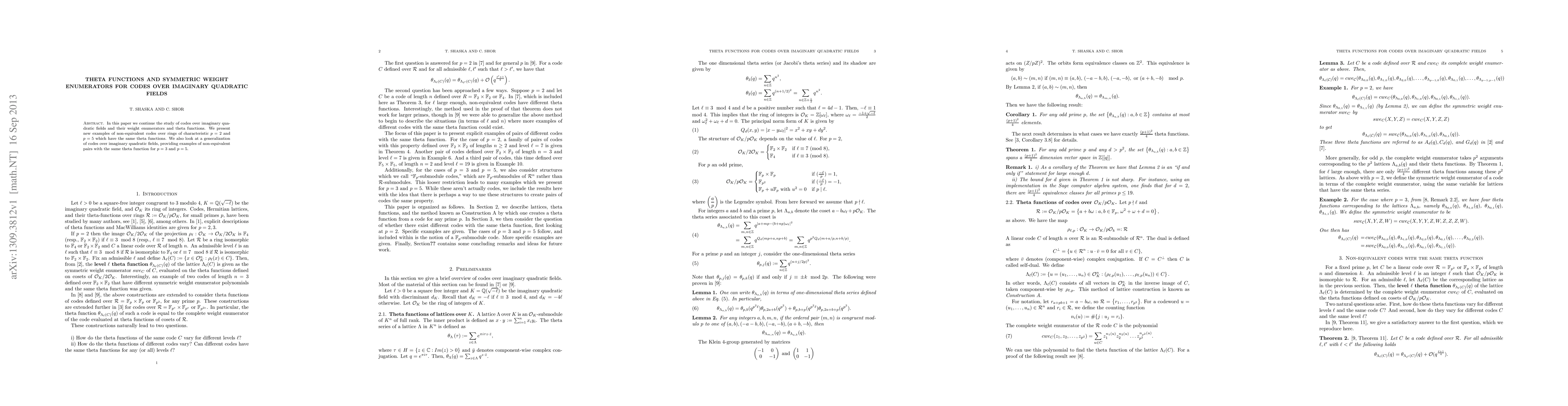 This paper explores codes over imaginary quadratic fields, finding non-equivalent examples with the same theta functions for characteristic p=2, 3, and 5.