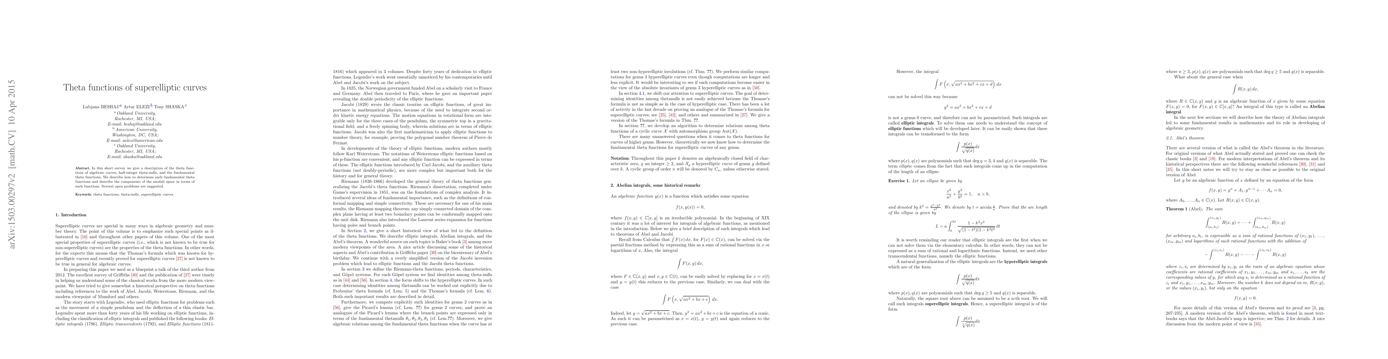 This paper provides an overview of theta functions associated with algebraic curves, focusing on superelliptic curves. It details the determination of fundamental theta functions and elucidates the structure of the moduli space through these functions.