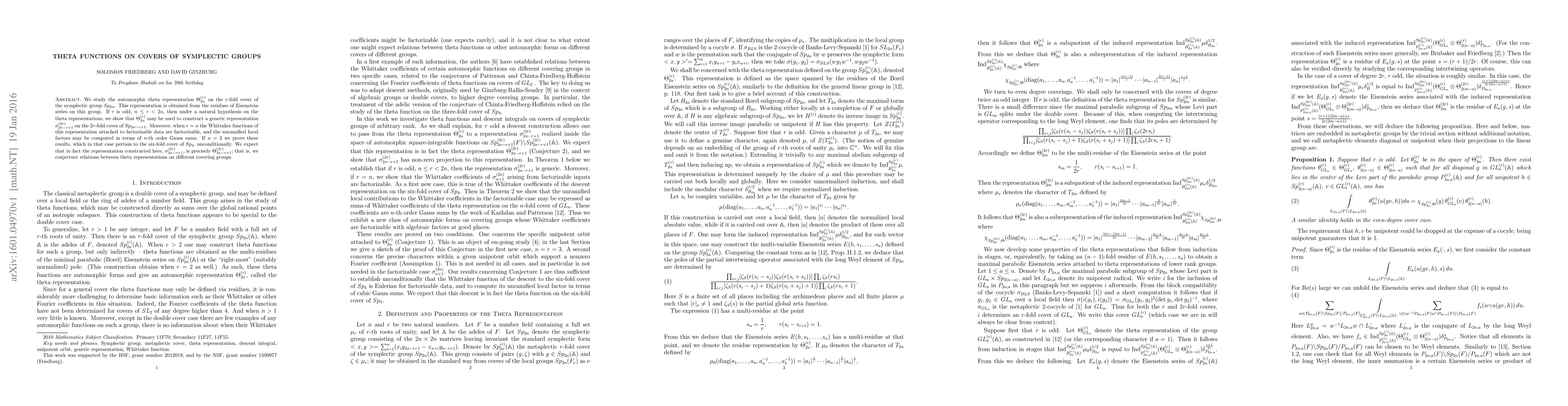 We study the automorphic theta representation $\Theta_{2n}^{(r)}$ on the $r$-fold cover of the symplectic group $Sp_{2n}$. This representation is obtained from the residues of Eisenstein series on this group. If $r$ is odd, $n\le r <2n$, then under a natural hypothesis on the theta representations, we show that $\Theta_{2n}^{(r)}$ may be used to construct a generic representation $\sigma_{2n-r+1}^{(2r)}$ on the $2r$-fold cover of $Sp_{2n-r+1}$. Moreover, when $r=n$ the Whittaker functions of this representation attached to factorizable data are factorizable, and the unramified local factors may be computed in terms of $n$-th order Gauss sums. If $n=3$ we prove these results, which in that case pertain to the six-fold cover of $Sp_4$, unconditionally. We expect that in fact the representation constructed here, $\sigma_{2n-r+1}^{(2r)}$, is precisely $\Theta_{2n-r+1}^{(2r)}$; that is, we conjecture relations between theta representations on different covering groups.