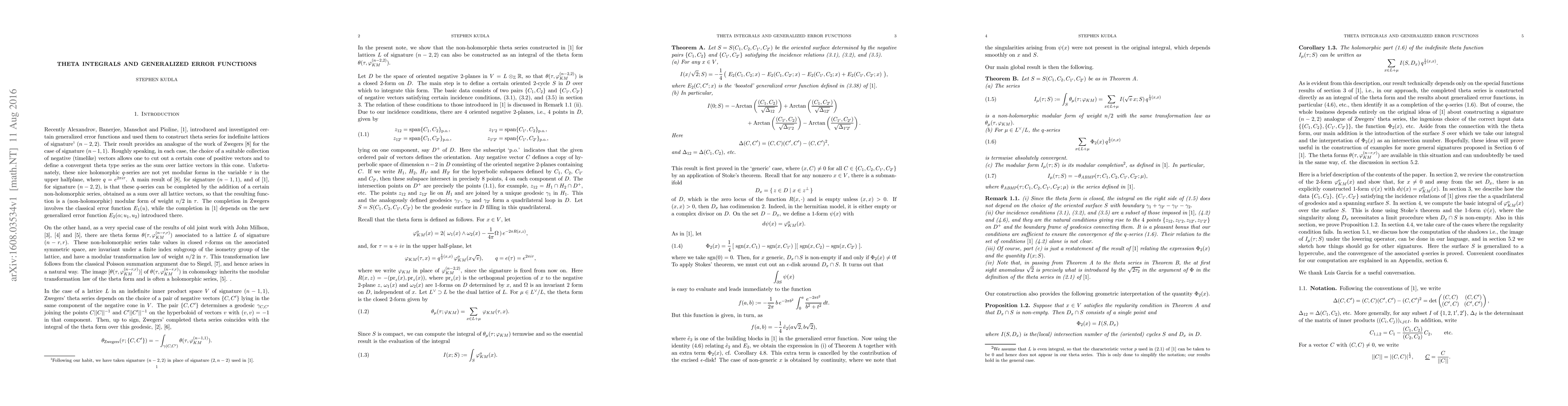 In a recent preprint, arXiv:1606.05495v1, Alexandrov, Banerjee, Manschot and Pioline introduced generalized error functions and used them to construct indefinite theta series associated to quadratic lattices L of signature (n-2,2). These series are generalizations of those constructed by Zwegers for lattices of signature (n-1,1) and are shown to be `modular completions' of certain nice $q$-series. In this paper, we show that the ABMP-indefinite theta series for signature (n-2,2) can also be obtained as integrals of the form valued theta series introduced in joint work with J. Millson in 1986. Given two pairs {C1,C2} and {C2,C2'} of negative vectors in the real quadratic space V obtained from L, we suppose that these vectors determine 4 distinct oriented negative 2-planes {C1,C2},{C1,C2'},{C1',C2'},{C1',C2} lying in the same component of the space D of oriented negative 2 -planes in V. These 2-planes determined a surface S in D and the non-holomorphic modular form obtained by integrating the KM-theta series over S is show to coincide with the ABMP-indefinite theta series. Moreover, the associated q-series in interpreted as the generating series for the intersection numbers of S with the codimension 2 subspaces D_x of D defined by positive lattice vectors.