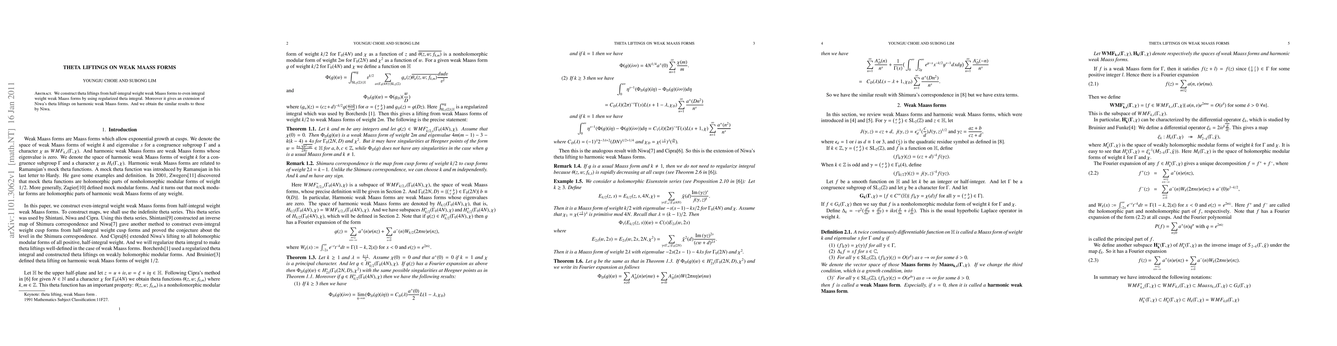 Summary: This paper constructs theta liftings transforming half-integral weight weak Maass forms into even integral weight weak Maass forms via regularized theta integrals, extending previous results by Niwa on harmonic weak Maass forms.