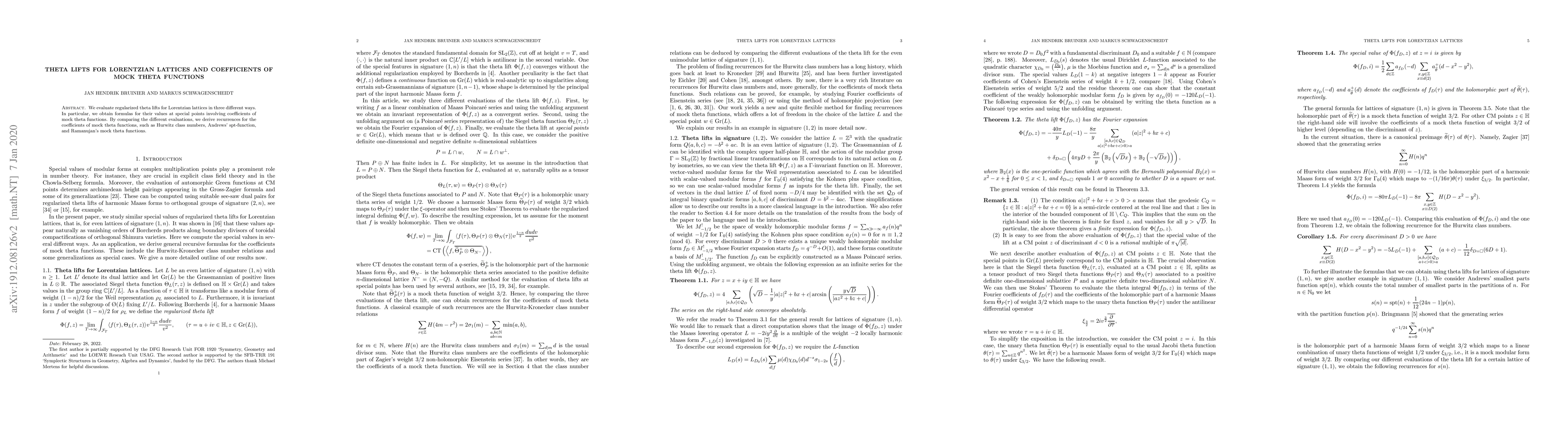 This paper evaluates theta lifts for Lorentzian lattices and finds formulas for their values at special points linked to coefficients of mock theta functions, deriving recurrences for notable functions such as Hurwitz class numbers and Ramanujan's mock theta functions.