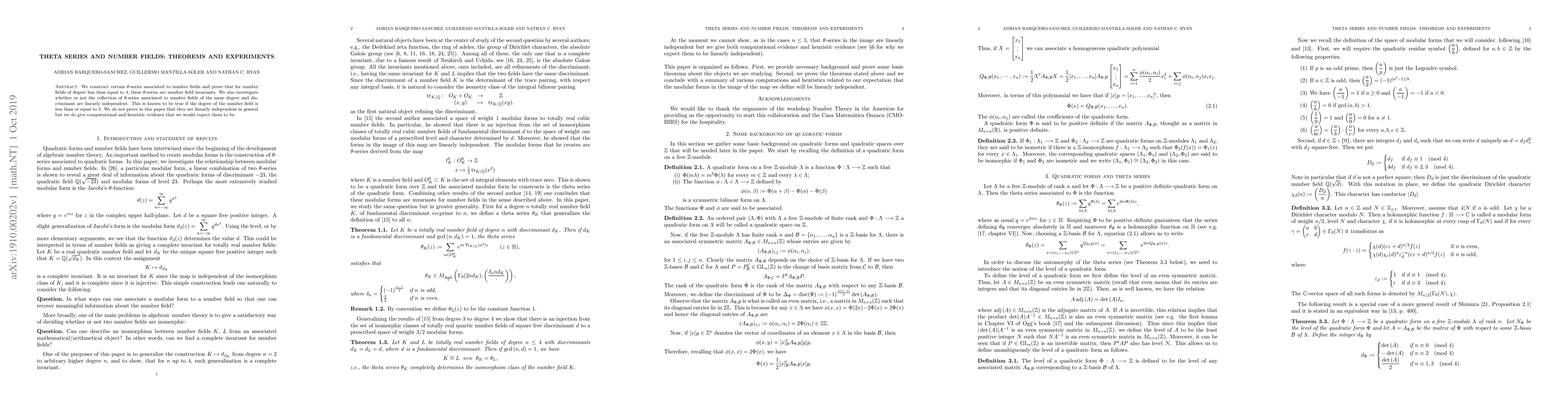 This paper constructs $\theta$-series linked to number fields and demonstrates they are invariants for fields of degree ≤ 4. While it doesn't prove their linear independence for all degrees, it provides computational evidence suggesting they remain linearly independent for fields of degree ≤ 3.