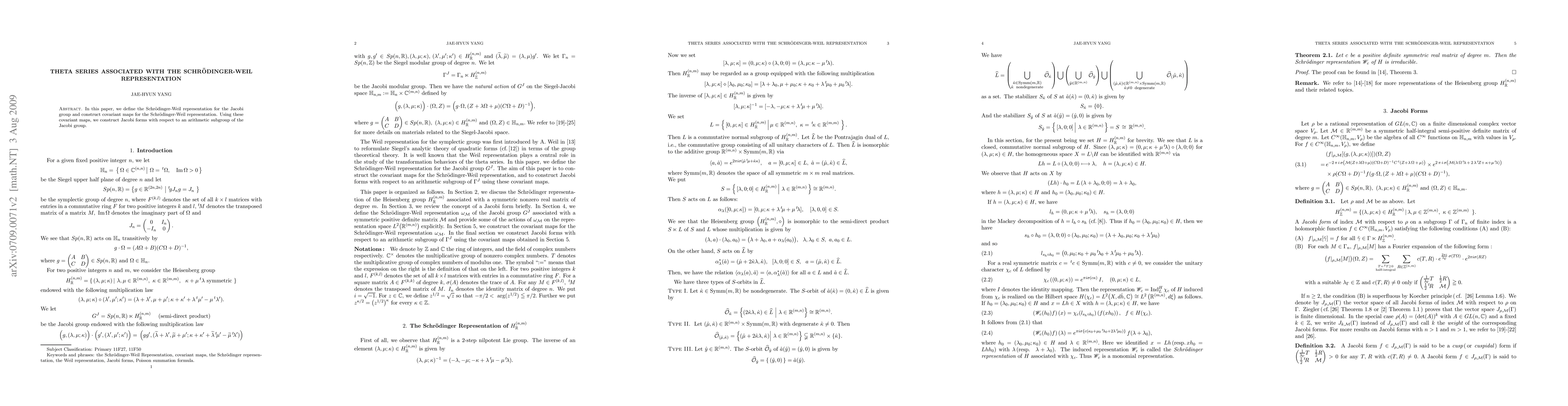 This paper defines the Weil-Schroedinger representation of the Jacobi group and demonstrates that the associated theta series is a Jacobi form concerning a specific arithmetic subgroup of the Jacobi modular group, linking it to the transformation properties of theta series.