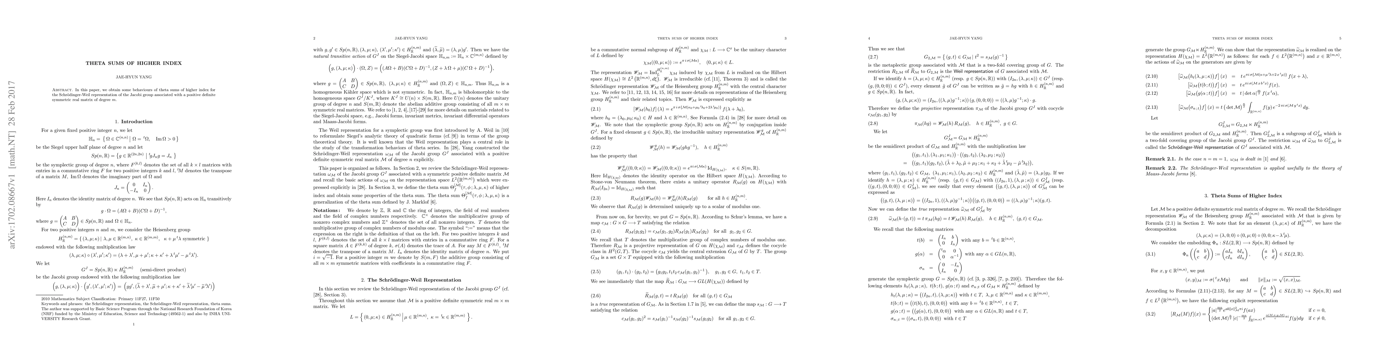 This paper explores the properties of theta sums in the Schroedinger-Weil representation of the Jacobi group, focusing on their behavior for higher index values.
