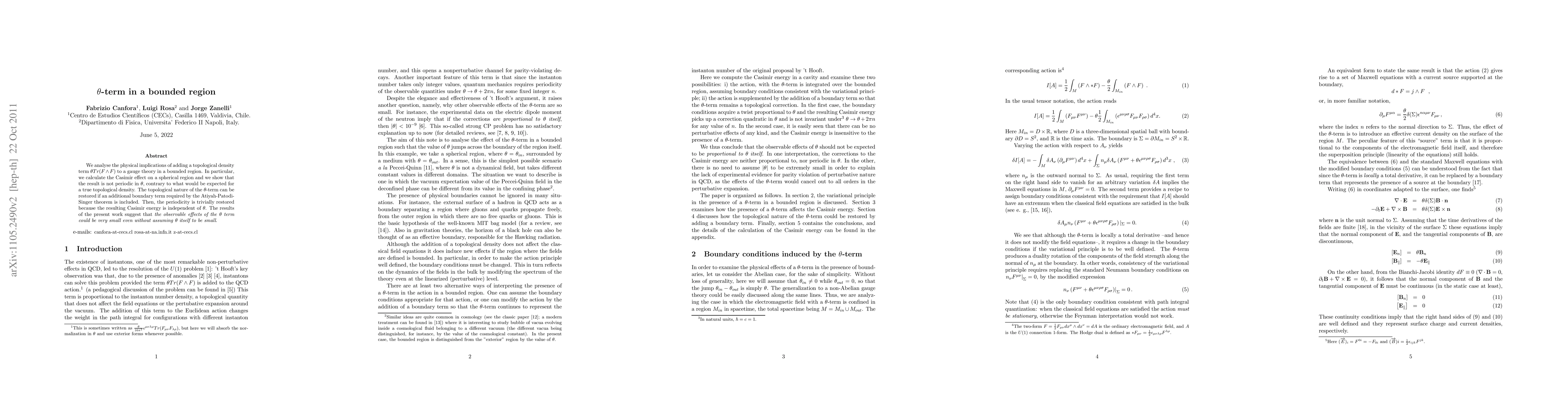 We analyse the physical implications of adding a topological density term $\theta Tr(F\wedge F)$ to a gauge theory in a bounded region. In particular, we calculate the Casimir effect on a spherical region and we show that the result is not periodic in $\theta$, contrary to what would be expected for a true topological density. The topological nature of the $\theta$-term can be restored if an additional boundary term required by the Atiyah-Patodi-Singer theorem is included. Then, the periodicity is trivially restored because the resulting Casimir energy is independent of $\theta$. The results of the present work suggest that the observable effects of the $\theta$-term could be very small even without assuming $\theta$ itself to be small.