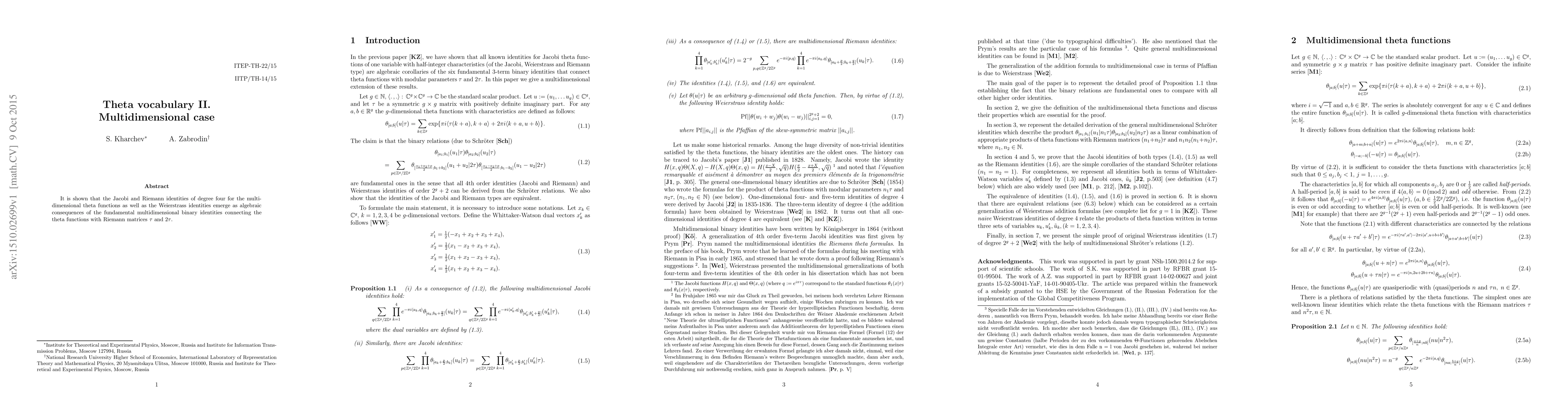 It is shown that the Jacobi and Riemann identities of degree four for the multidimensional theta functions as well as the Weierstrass identities emerge as algebraic consequences of the fundamental multidimensional binary identities connecting the theta functions with Riemann matrices $\tau$ and $2\tau$.