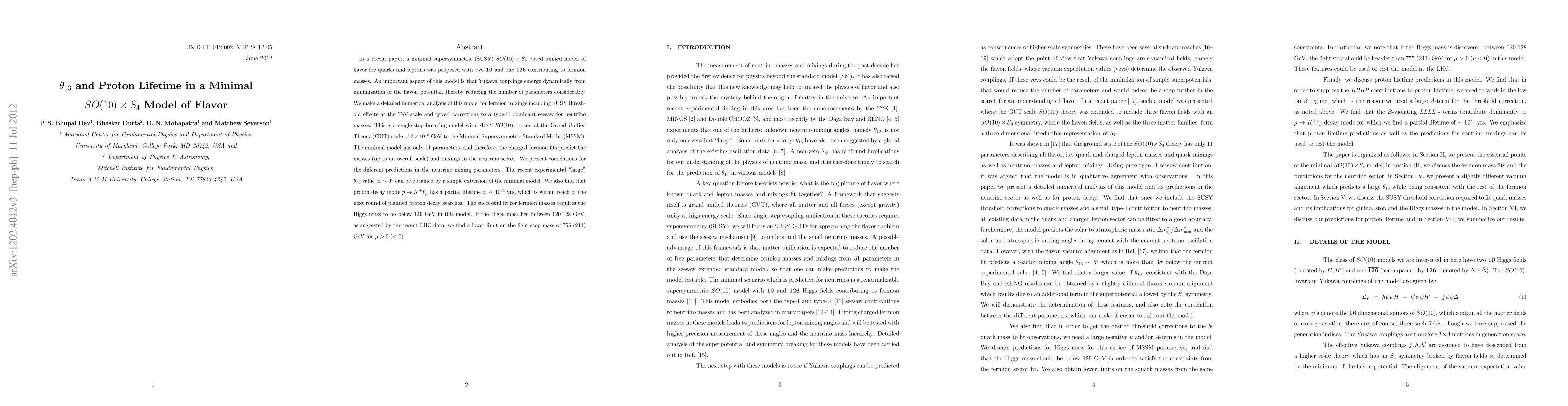 This paper explores a minimal supersymmetric SO(10) x S_4 unified model that dynamically determines Yukawa couplings, resulting in a model with only 11 parameters. It predicts a large θ_{13} value and a proton decay mode with a partial lifetime of ~10^34 years, aligning with experimental expectations and next-generation searches.