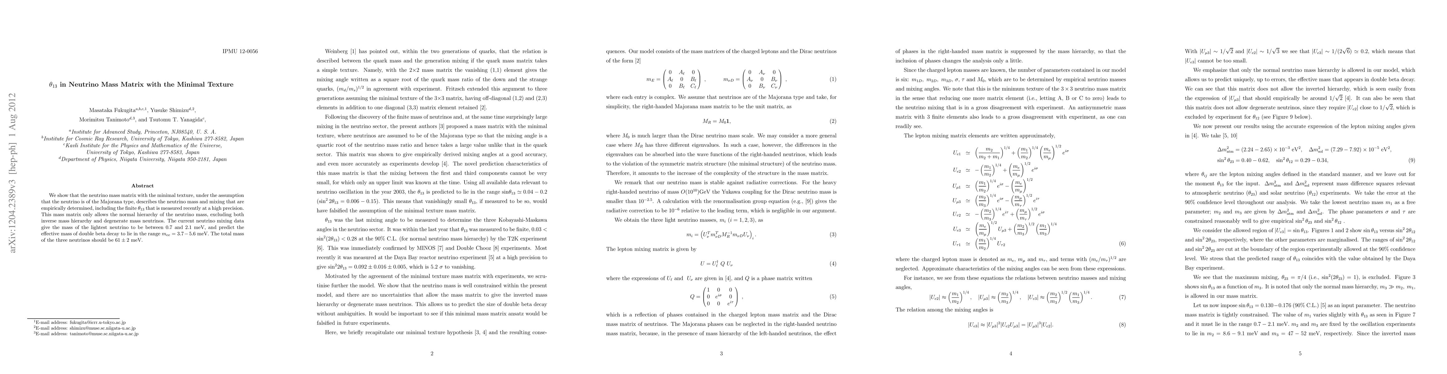 The paper demonstrates that a minimal neutrino mass matrix can explain current neutrino mass and mixing measurements, including the precisely measured $ heta_{13}$. This matrix predicts a normal neutrino mass hierarchy, ruling out inverted and degenerate hierarchies, and forecasts the effective mass for double beta decay to be between 3.7-5.6 eV.