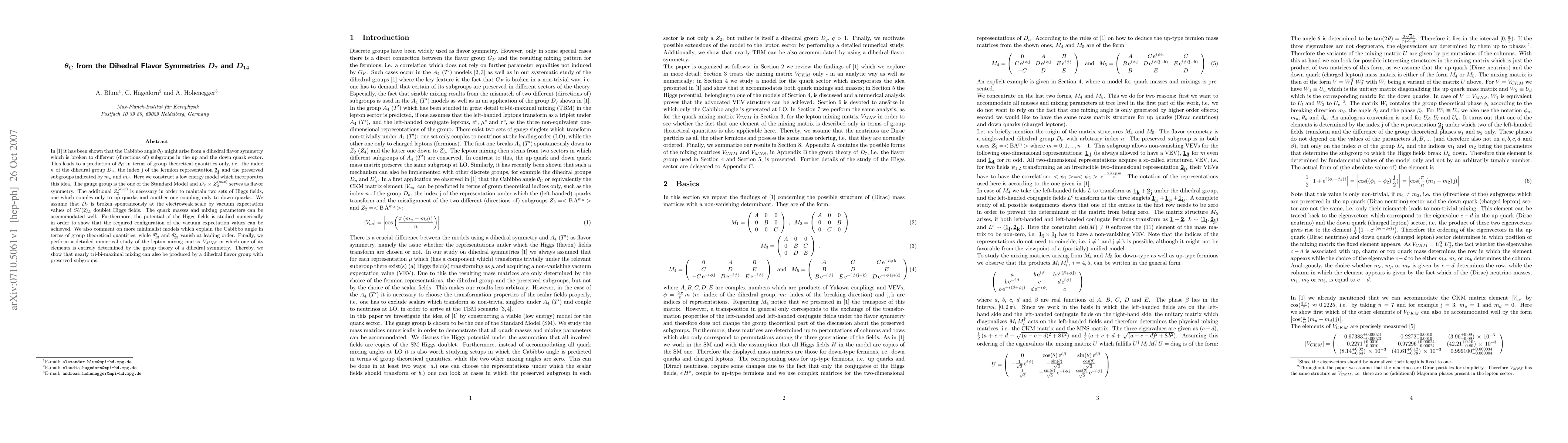 In [1] it has been shown that the Cabibbo angle theta_C might arise from a dihedral flavor symmetry which is broken to different (directions of) subgroups in the up and the down quark sector. This leads to a prediction of theta_C in terms of group theoretical quantities only, i.e. the index n of the dihedral group D_n, the index j of the fermion representation 2_j and the preserved subgroups indicated by m_u and m_d. Here we construct a low energy model which incorporates this idea. The gauge group is the one of the Standard Model and D_7 x Z_2 ^(aux) serves as flavor symmetry. The additional Z_2 ^(aux) is necessary in order to maintain two sets of Higgs fields, one which couples only to up quarks and another one coupling only to down quarks. We assume that D_7 is broken spontaneously at the electroweak scale by vacuum expectation values of SU(2)_L doublet Higgs fields. The quark masses and mixing parameters can be accommodated well. Furthermore, the potential of the Higgs fields is studied numerically in order to show that the required configuration of the vacuum expectation values can be achieved. We also comment on more minimalist models which explain the Cabibbo angle in terms of group theoretical quantities, while theta_{13}^q and theta_{23}^q vanish at leading order. Finally, we perform a detailed numerical study of the lepton mixing matrix V_{MNS} in which one of its elements is entirely determined by the group theory of a dihedral symmetry. Thereby, we show that nearly tri-bi-maximal mixing can also be produced by a dihedral flavor group with preserved subgroups.