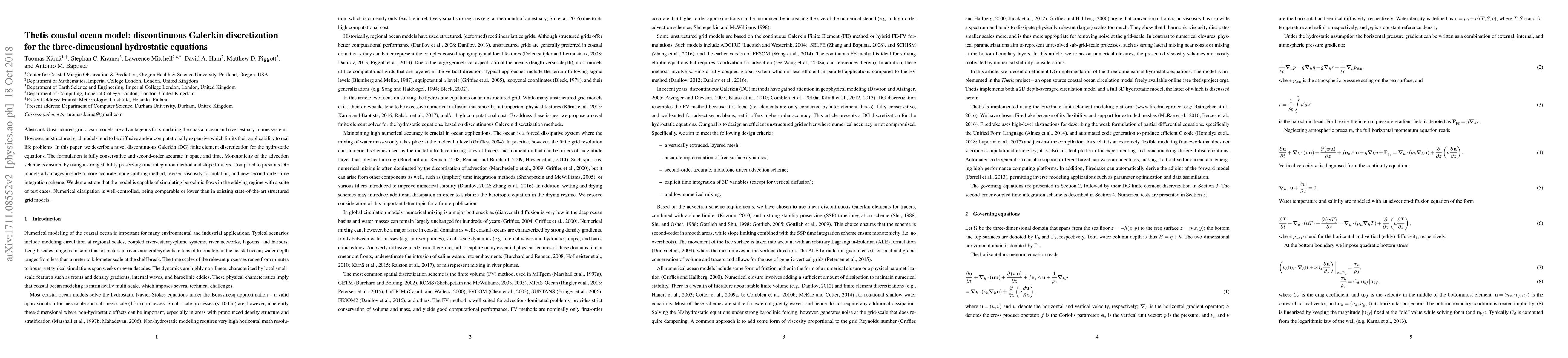 This paper introduces a novel discontinuous Galerkin (DG) finite element discretization for the three-dimensional hydrostatic equations, offering improved computational efficiency and accuracy over unstructured grid models. The method demonstrates effective simulation of baroclinic flows with controlled numerical dissipation.
