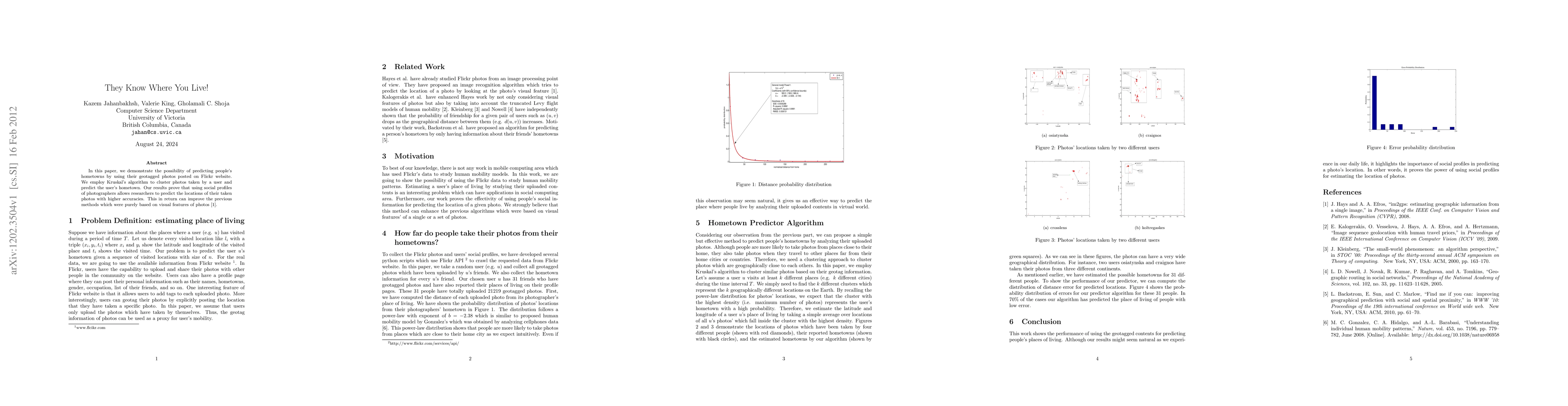 In this paper, we demonstrate the possibility of predicting people's hometowns by using their geotagged photos posted on Flickr website. We employ Kruskal's algorithm to cluster photos taken by a user and predict the user's hometown. Our results prove that using social profiles of photographers allows researchers to predict the locations of their taken photos with higher accuracies. This in return can improve the previous methods which were purely based on visual features of photos \cite{Hays:im2gps}.