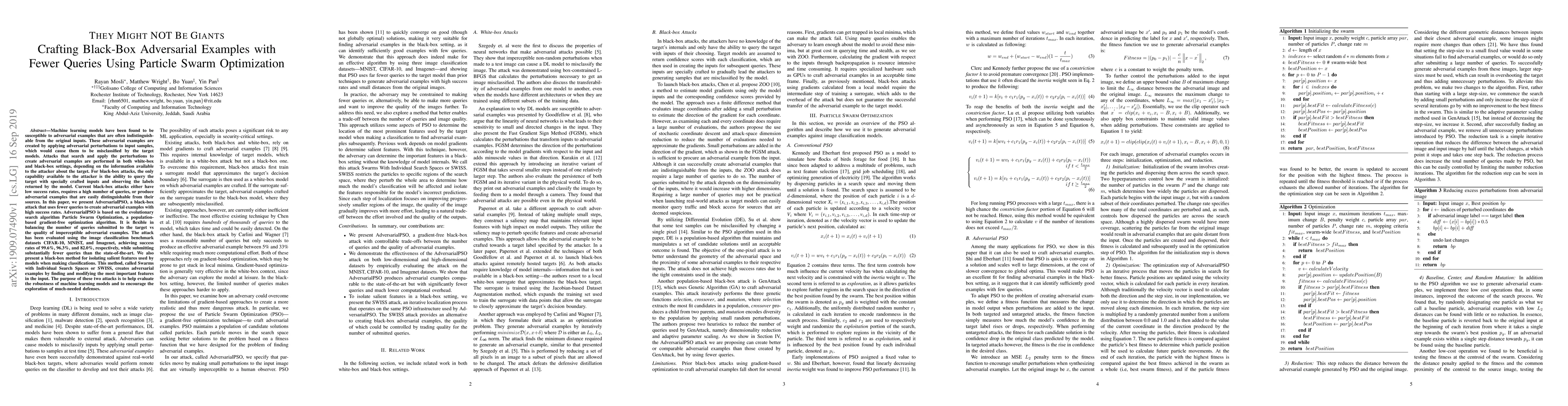 This paper introduces AdversarialPSO, a black-box attack leveraging Particle Swarm Optimization to craft adversarial examples with high success rates using fewer queries compared to existing methods. The method also includes SWISS, a technique for isolating and modifying salient features to generate imperceptible adversarial examples.