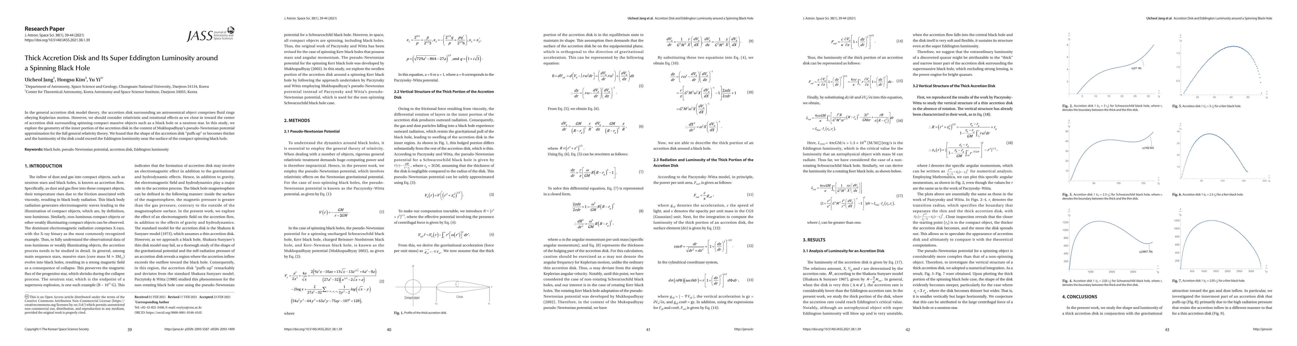 In the general accretion disk model theory, the accretion disk surrounding an astronomical object comprises fluid rings obeying Keplerian motion. However, we should consider relativistic and rotational effects as we close in toward the center of accretion disk surrounding spinning compact massive objects such as a black hole or a neutron star. In this study, we explore the geometry of the inner portion of the accretion disk in the context of Mukhopadhyay's pseudo Newtonian potential approximation for the full general relativity theory. We found that the shape of the accretion disk "puffs up" or becomes thicker and the luminosity of the disk could exceed the Eddington luminosity near the surface of the compact spinning black hole.