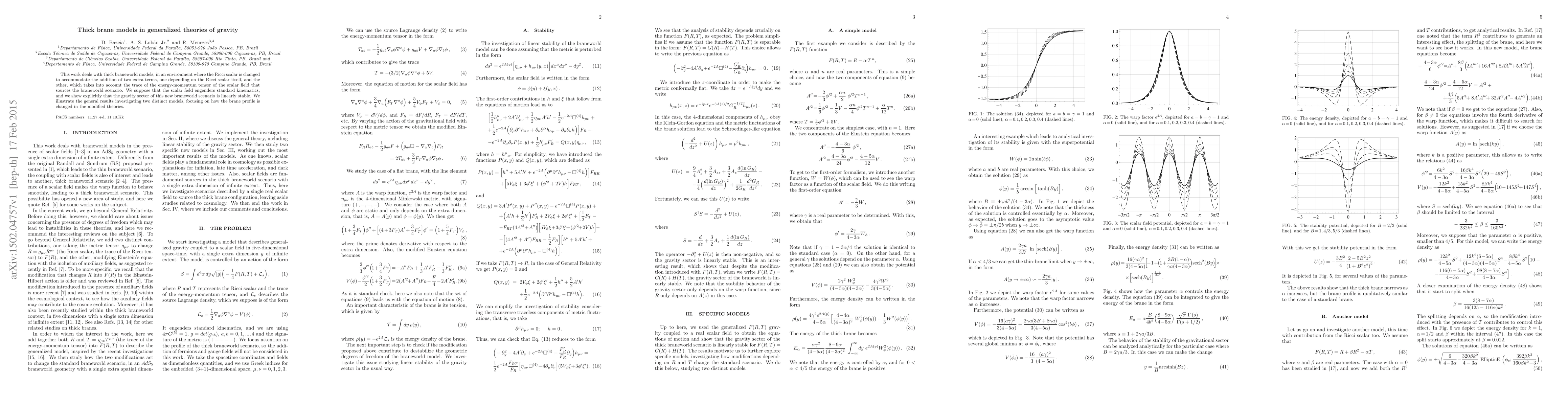 This work deals with thick braneworld models, in an environment where the Ricci scalar is changed to accommodate the addition of two extra terms, one depending on the Ricci scalar itself, and the other, which takes into account the trace of the energy-momentum tensor of the scalar field that sources the braneworld scenario. We suppose that the scalar field engenders standard kinematics, and we show explicitly that the gravity sector of this new braneworld scenario is linearly stable. We illustrate the general results investigating two distinct models, focusing on how the brane profile is changed in the modified theories.
