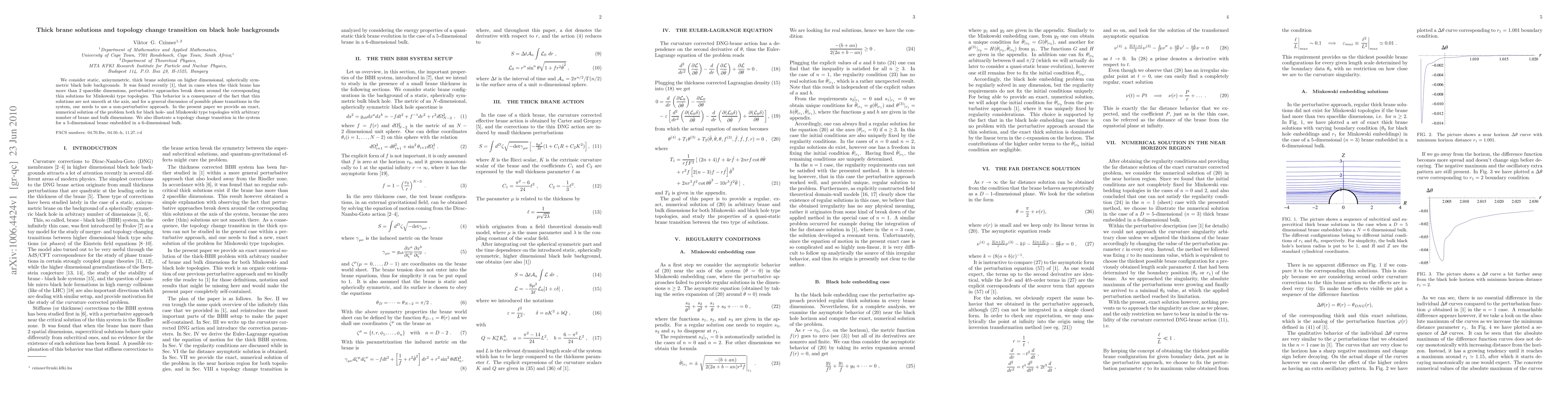 This paper investigates static, axisymmetric thick brane solutions on higher-dimensional black hole backgrounds, providing exact numerical solutions for both black hole and Minkowski topologies. It highlights a topology change transition in a 5D brane within a 6D bulk, demonstrating the necessity of non-perturbative methods for understanding phase transitions.