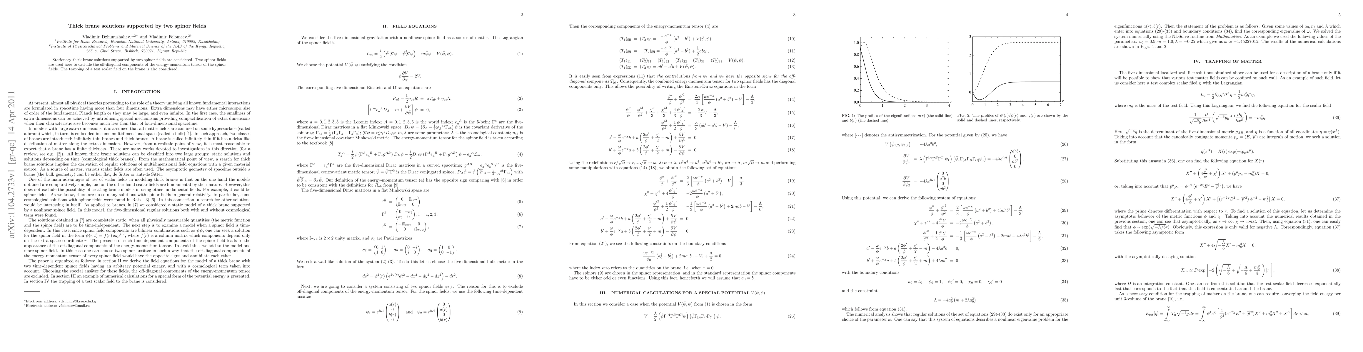 This paper explores stationary thick brane solutions maintained by two spinor fields to eliminate off-diagonal components in the energy-momentum tensor, and investigates the trapping of a test scalar field on the brane.