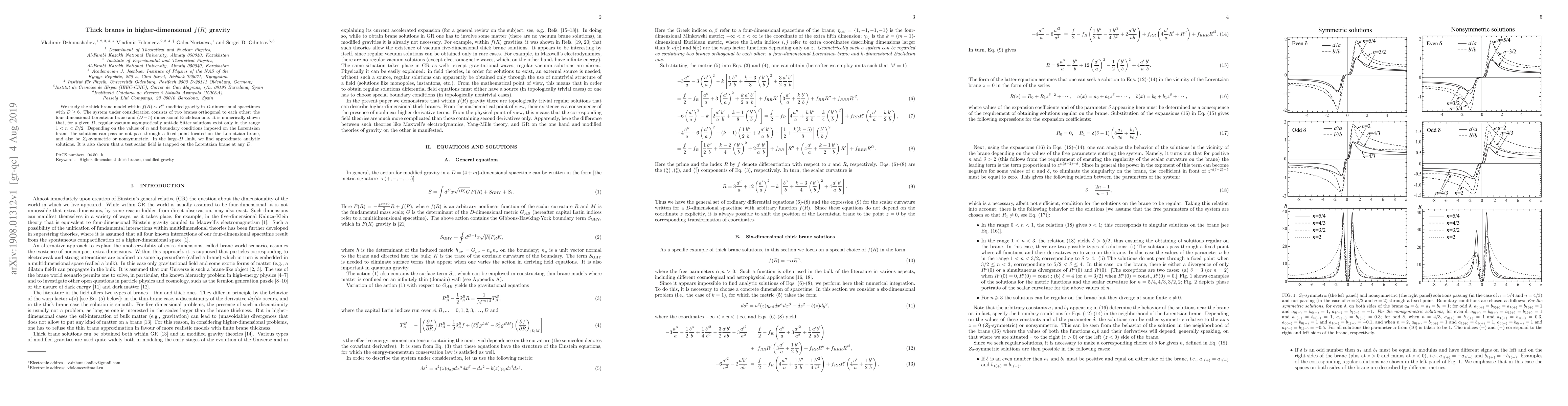 This paper investigates thick brane models in $f(R)\sim R^n$ modified gravity across $D$-dimensional spacetimes, revealing that regular vacuum solutions exist only for $1<n<D/2$. The study finds that solutions can exhibit $Z_2$-symmetry depending on $n$ and boundary conditions, and a test scalar field is consistently trapped on the Lorentzian brane.
