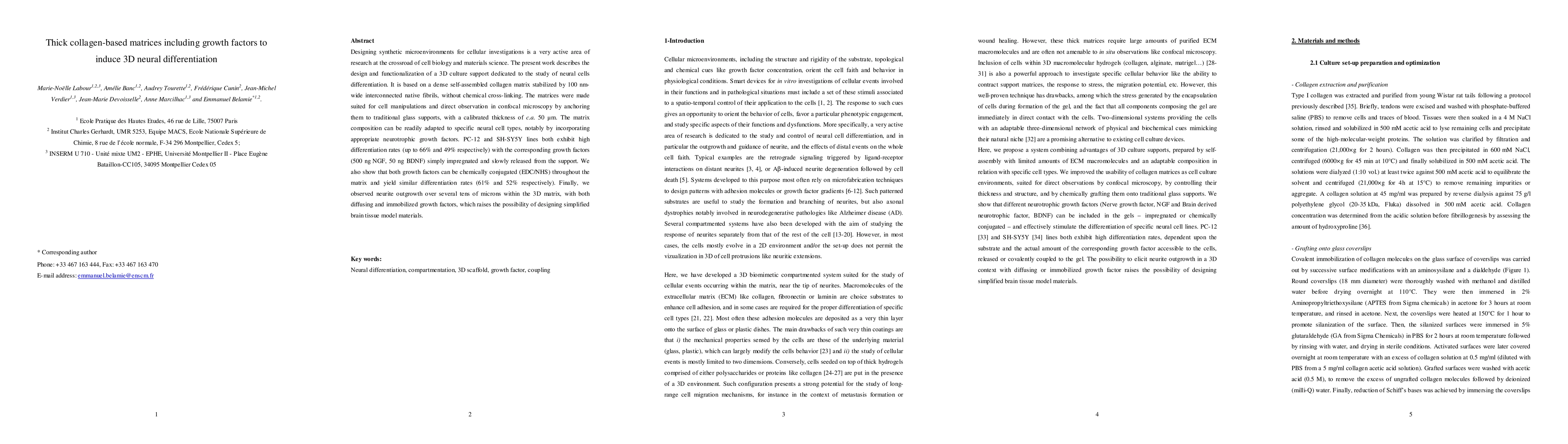 Designing synthetic microenvironments for cellular investigations is a very active area of research at the crossroads of cell biology and materials science. The present work describes the design and functionalization of a three-dimensional (3D) culture support dedicated to the study of neurite outgrowth from neural cells. It is based on a dense self-assembled collagen matrix stabilized by 100-nm-wide interconnected native fibrils without chemical crosslinking. The matrices were made suitable for cell manipulation and direct observation in confocal microscopy by anchoring them to traditional glass supports with a calibrated thickness of similar to 50 mu m. The matrix composition can be readily adapted to specific neural cell types, notably by incorporating appropriate neurotrophic growth factors. Both PC-12 and SH-SY5Y lines respond to growth factors (nerve growth factor and brain-derived neurotrophic factor, respectively) impregnated and slowly released from the support. Significant neurite outgrowth is reported for a large proportion of cells, up to 66% for PC12 and 49% for SH-SY5Y. It is also shown that both growth factors can be chemically conjugated (EDC/NHS) throughout the matrix and yield similar proportions of cells with longer neurites (61% and 52%, respectively). Finally, neurite outgrowth was observed over several tens of microns within the 3D matrix, with both diffusing and immobilized growth factors. (C) 2012 Acta Materialia Inc. Published by Elsevier Ltd. All rights reserved.