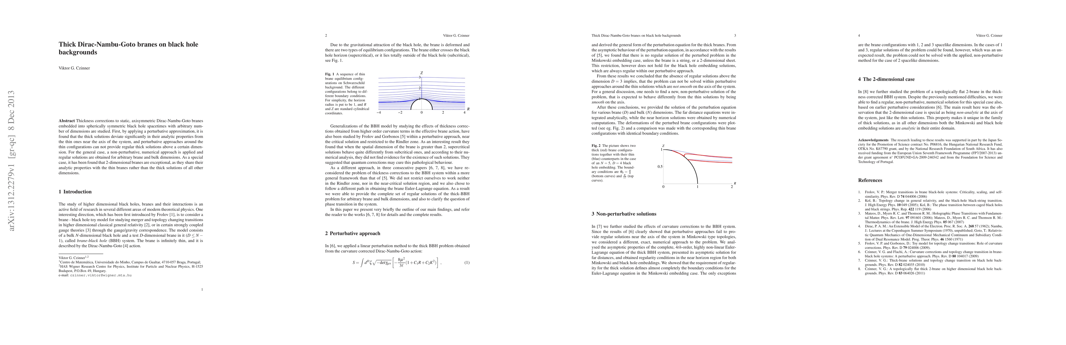 Thickness corrections to static, axisymmetric Dirac-Nambu-Goto branes embedded into spherically symmetric black hole spacetimes with arbitrary number of dimensions are studied. First, by applying a perturbative approximation, it is found that the thick solutions deviate significantly in their analytic properties from the thin ones near the axis of the system, and perturbative approaches around the thin configurations can not provide regular thick solutions above a certain dimension. For the general case, a non-perturbative, numerical approach is applied and regular solutions are obtained for arbitrary brane and bulk dimensions. As a special case, it has been found that 2-dimensional branes are exceptional, as they share their analytic properties with the thin branes rather than the thick solutions of all other dimensions.