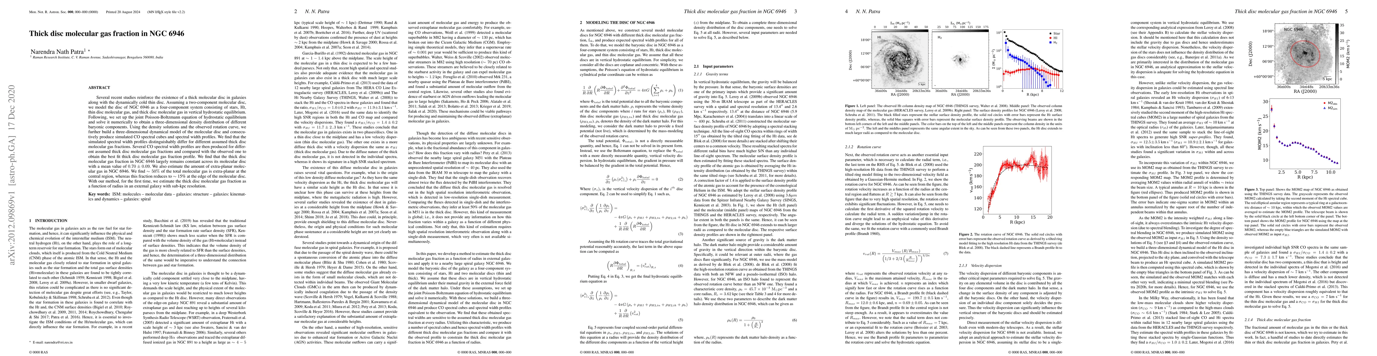 This study models NGC 6946's molecular disc as a four-component system and finds that the thick disc molecular gas fraction remains constant at a mean value of $0.70 \pm 0.09$ across the disc. Additionally, it estimates that about 50% of the molecular gas is extra-planar in the central region, decreasing to 15% at the molecular disc's edge.