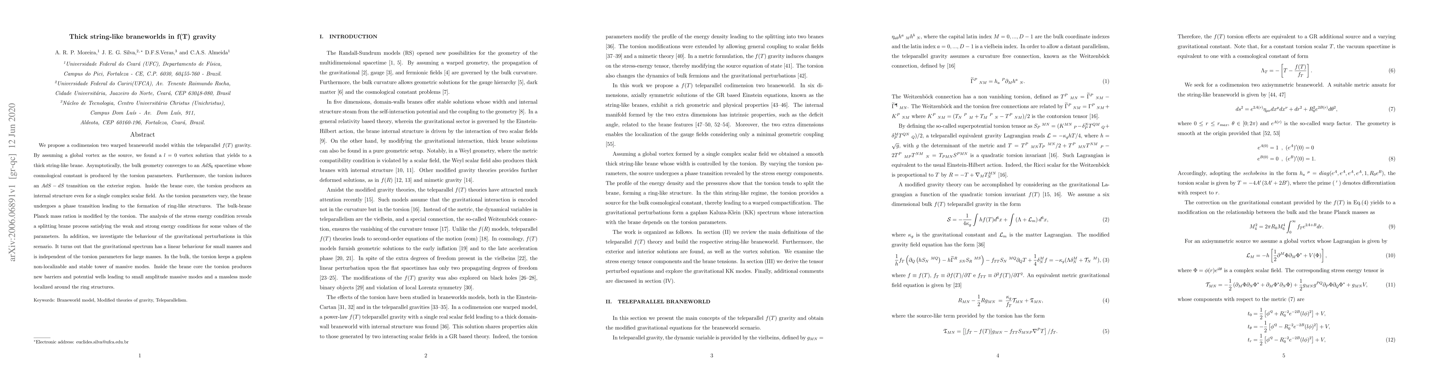 This research paper proposes a new type of braneworld model that creates thick string-like structures in a gravitational theory called f(T) gravity, with implications for the formation of black holes and the behavior of gravitational waves.