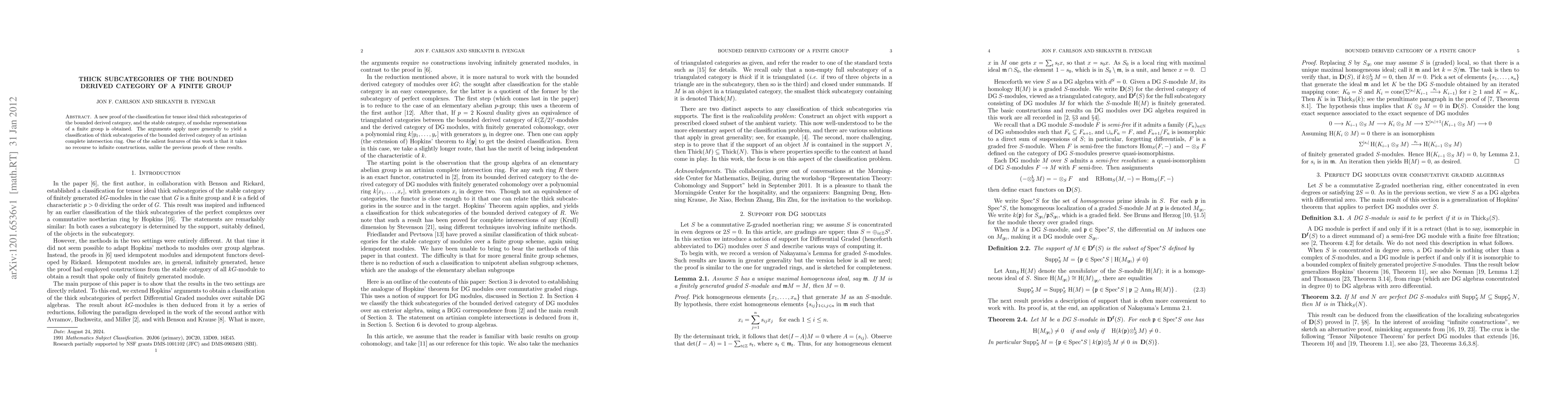 A new proof of the classification for tensor ideal thick subcategories of the bounded derived category, and the stable category, of modular representations of a finite group is obtained. The arguments apply more generally to yield a classification of thick subcategories of the bounded derived category of an artinian complete intersection ring. One of the salient features of this work is that it takes no recourse to infinite constructions, unlike the previous proofs of these results.