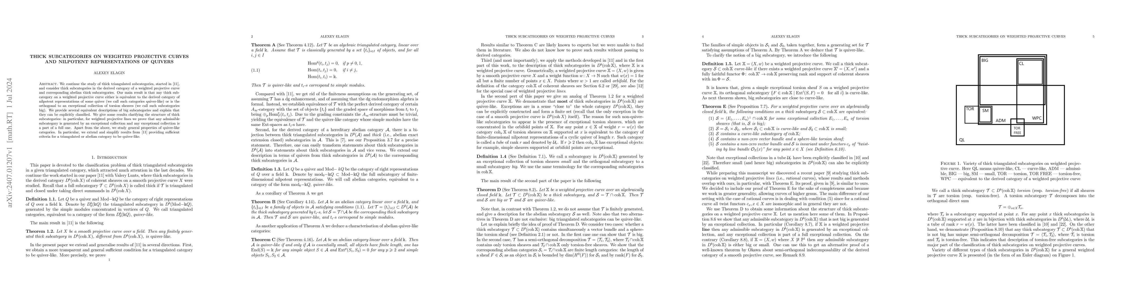 This paper explores thick subcategories in the derived category of weighted projective curves and links them to nilpotent representations of quivers. It establishes that these subcategories are either quiver-like or orthogonal to exceptional collections, providing explicit classifications and criteria for both types.