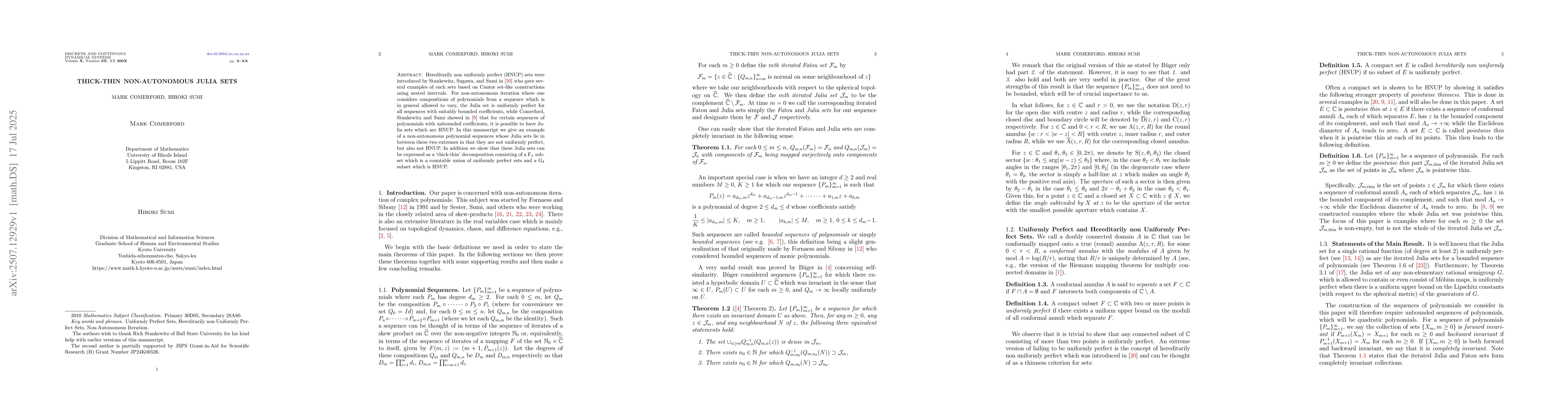 Hereditarily non uniformly perfect (HNUP) sets were introduced by Stankewitz, Sugawa, and Sumi in \cite{SSS} who gave several examples of such sets based on Cantor set-like constructions using nested intervals. For non-autonomous iteration where one considers compositions of polynomials from a sequence which is in general allowed to vary, the Julia set is uniformly perfect for all sequences with suitably bounded coefficients, while Comerford, Stankewitz and Sumi showed in \cite{CSS} that for certain sequences of polynomials with unbounded coefficients, it is possible to have Julia sets which are HNUP. In this manuscript we give an example of a non-autonomous polynomial sequences whose Julia sets lie in between these two extremes in that they are not uniformly perfect, but also not HNUP. In addition we show that these Julia sets can be expressed as a `thick-thin' decomposition consisting of a ${\mathrm F}_\sigma$ subset which is a countable union of uniformly perfect sets and a ${\mathrm G}_\delta$ subset which is HNUP.