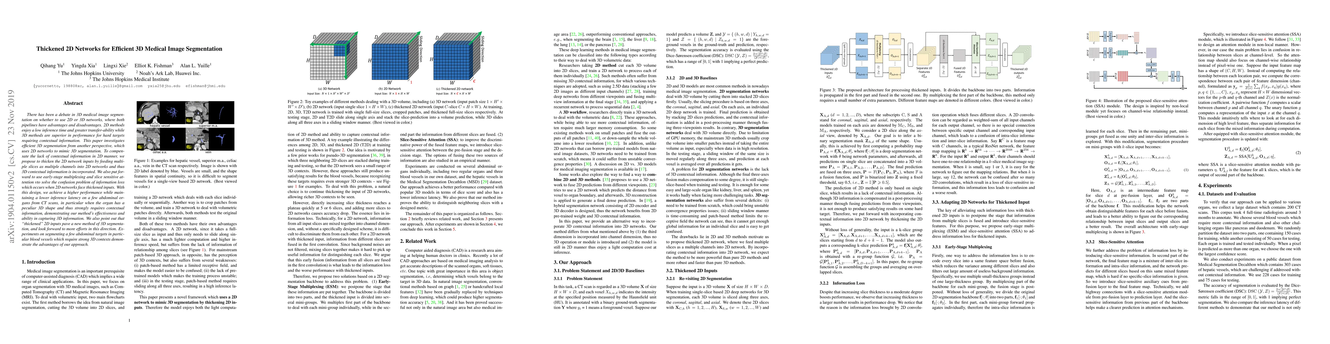 This paper proposes a method to enhance 2D networks for 3D medical image segmentation by thickening 2D inputs with multiple slices, incorporating 3D contextual information. It uses early-stage multiplexing and slice-sensitive attention to mitigate information loss, achieving higher performance with lower latency for segmenting complex 3D structures like blood vessels in CT scans.