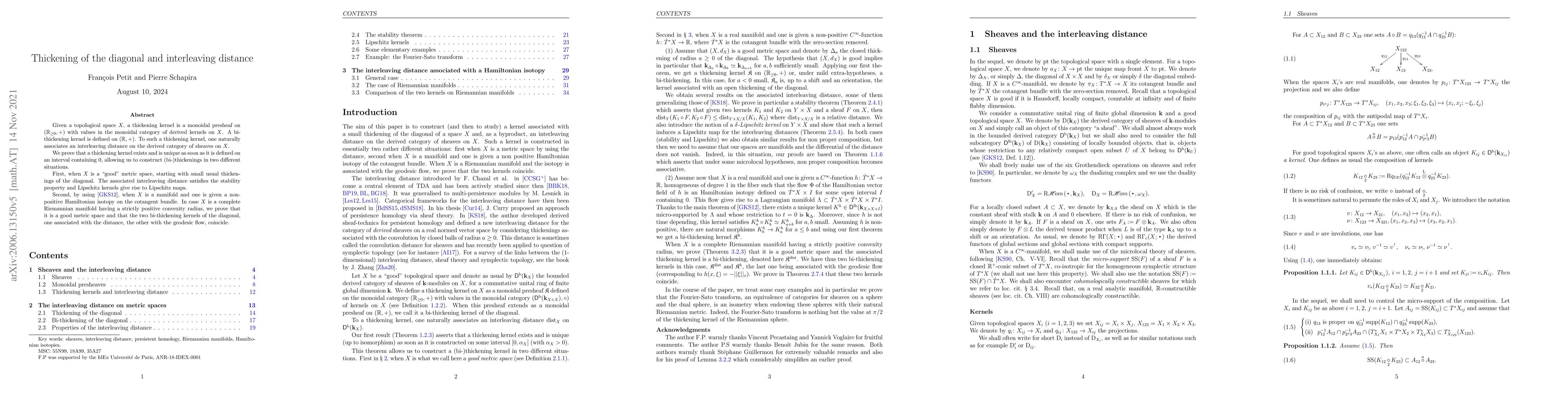 Given a topological space $X$, a thickening kernel is a monoidal presheaf on $(\mathbb{R}_{\geq0},+)$ with values in the monoidal category of derived kernels on $X$. A bi-thickening kernel is defined on $(\mathbb{R},+)$. To such a thickening kernel, one naturally associates an interleaving distance on the derived category of sheaves on $X$. We prove that a thickening kernel exists and is unique as soon as it is defined on an interval containing $0$, allowing us to construct (bi-)thickenings in two different situations. First, when $X$ is a ``good'' metric space, starting with small usual thickenings of the diagonal. The associated interleaving distance satisfies the stability property and Lipschitz kernels give rise to Lipschitz maps. Second, by using [GKS12], when $X$ is a manifold and one is given a non-positive Hamiltonian isotopy on the cotangent bundle. In case $X$ is a complete Riemannian manifold having a strictly positive convexity radius, we prove that it is a good metric space and that the two bi-thickening kernels of the diagonal, one associated with the distance, the other with the geodesic flow, coincide.