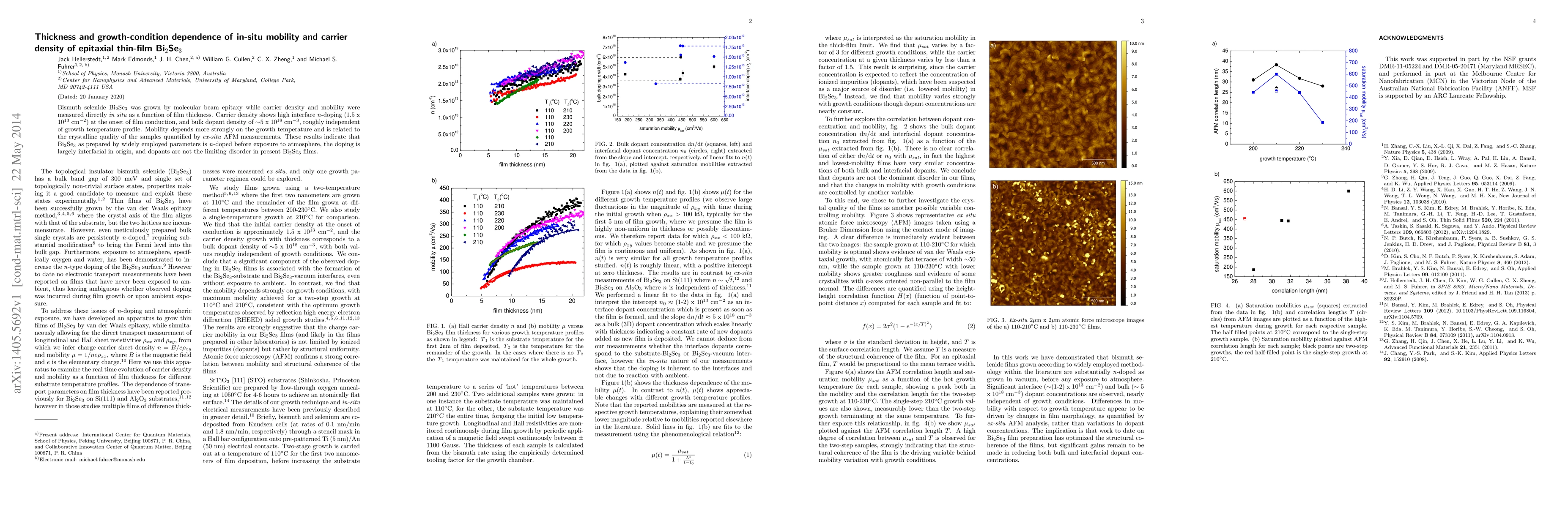 This study investigates the thickness and growth-condition dependence of in-situ mobility and carrier density in epitaxial thin-film Bi$_2$Se$_3$ grown by molecular beam epitaxy. The findings suggest high interface n-doping and bulk dopant density, with mobility linked to crystalline quality rather than dopant density.