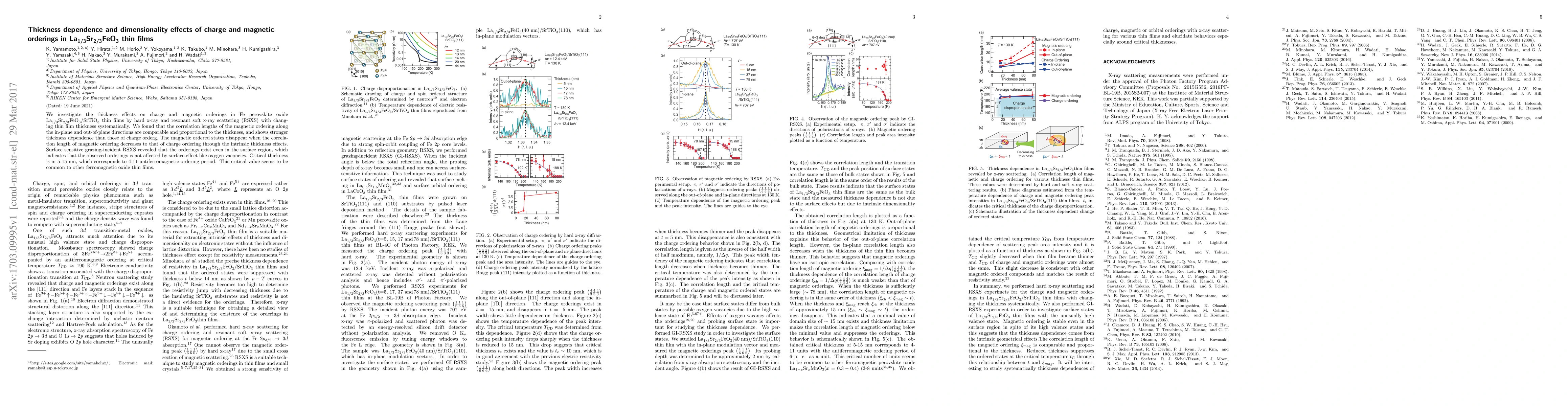 We investigate the thickness effects on charge and magnetic orderings in Fe perovskite oxide La1/3Sr2/3FeO3/SrTiO3 thin films by hard x-ray and resonant soft x-ray scattering (RSXS) with changing thin film thickness systematically. We found that the correlation lengths of the magnetic ordering along the in-plane and out-of-plane directions are comparable and proportional to the thickness, and shows stronger thickness dependence than those of charge orderg. %the thickness dependence of correlation length of charge ordering is smaller than that of magnetic orderings. The magnetic ordered states disappear when the correlation length of magnetic ordering decreases to that of charge ordering through the intrinsic thickness effects. Surface sensitive grazing-incident RSXS revealed that the orderings exist even in the surface region, which indicates that the observed orderings is not affected by surface effect like oxygen vacancies. Critical thickness is in 5-15 nm, which corresponds to 4-11 antiferromagnetic ordering period. This critical value seems to be common to other ferromagnetic oxide thin films.