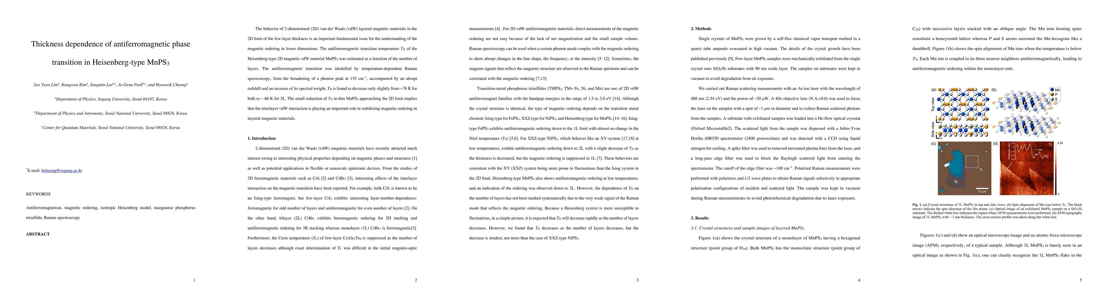The behavior of 2-dimensional (2D) van der Waals (vdW) layered magnetic materials in the 2D limit of the few-layer thickness is an important fundamental issue for the understanding of the magnetic ordering in lower dimensions. The antiferromagnetic transition temperature TN of the Heisenberg-type 2D magnetic vdW material MnPS3 was estimated as a function of the number of layers. The antiferromagnetic transition was identified by temperature-dependent Raman spectroscopy, from the broadening of a phonon peak at 155 cm-1, accompanied by an abrupt redshift and an increase of its spectral weight. TN is found to decrease only slightly from ~78 K for bulk to ~ 66 K for 3L. The small reduction of TN in thin MnPS3 approaching the 2D limit implies that the interlayer vdW interaction is playing an important role in stabilizing magnetic ordering in layered magnetic materials.