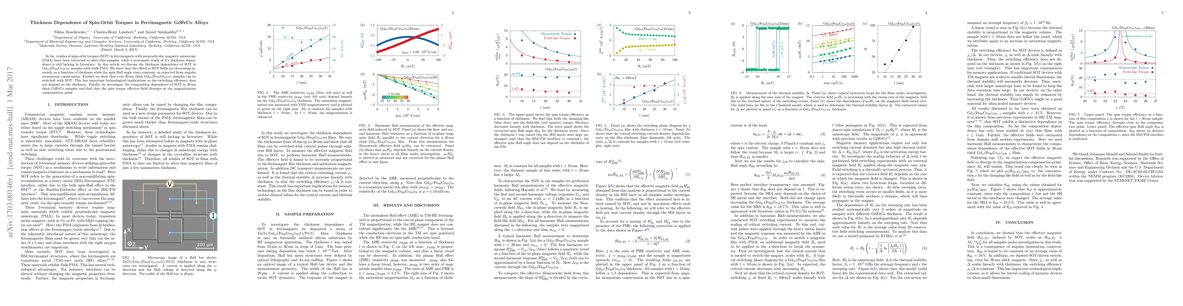This paper investigates the thickness dependence of spin-orbit torques (SOT) in ferrimagnetic GdFeCo alloys with bulk perpendicular magnetic anisotropy (PMA), finding that effective SOT fields decrease inversely with thickness while spin-Hall angle remains constant. It concludes that SOT can switch even 30nm thick samples efficiently, with important technological implications.