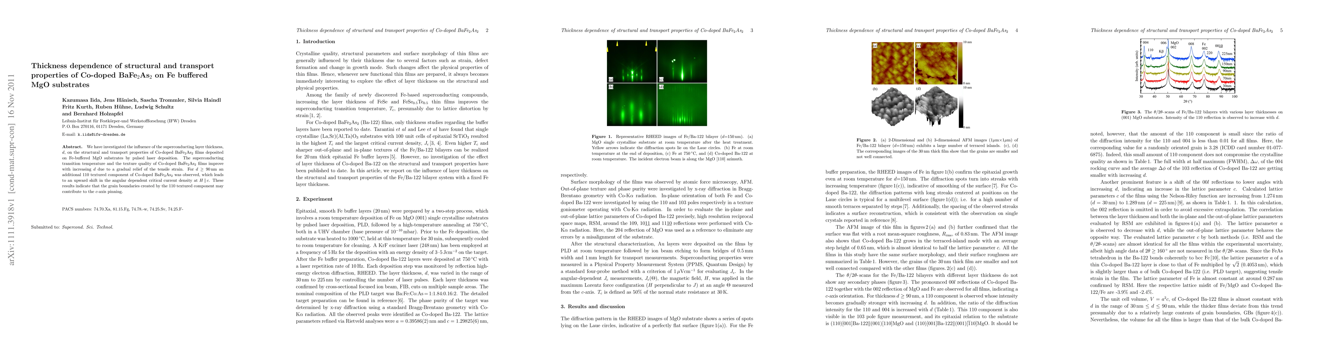 This study investigates how the thickness of Co-doped BaFe2As2 films affects their structural and transport properties when deposited on Fe-buffered MgO substrates. The superconducting transition temperature and film texture improve with increasing thickness due to reduced tensile strain, while a 110 textured component enhances c-axis pinning above 90 nm.