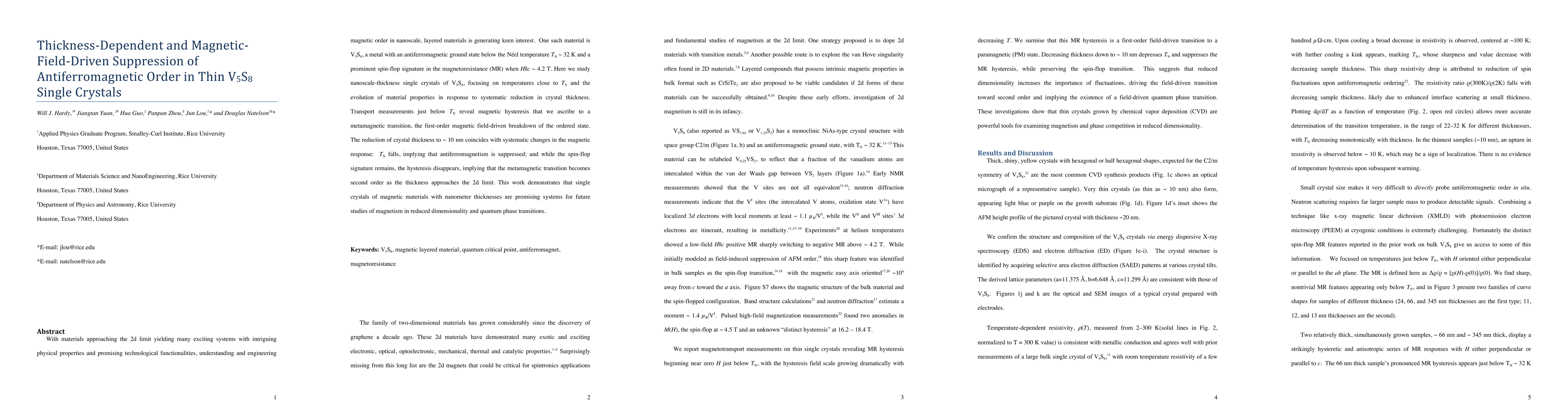 Researchers studied V$_{5}$S$_{8}$ single crystals with varying thicknesses, finding that thinner crystals suppress antiferromagnetic order as the magnetic field is applied, revealing new insights into magnetism in reduced dimensions.