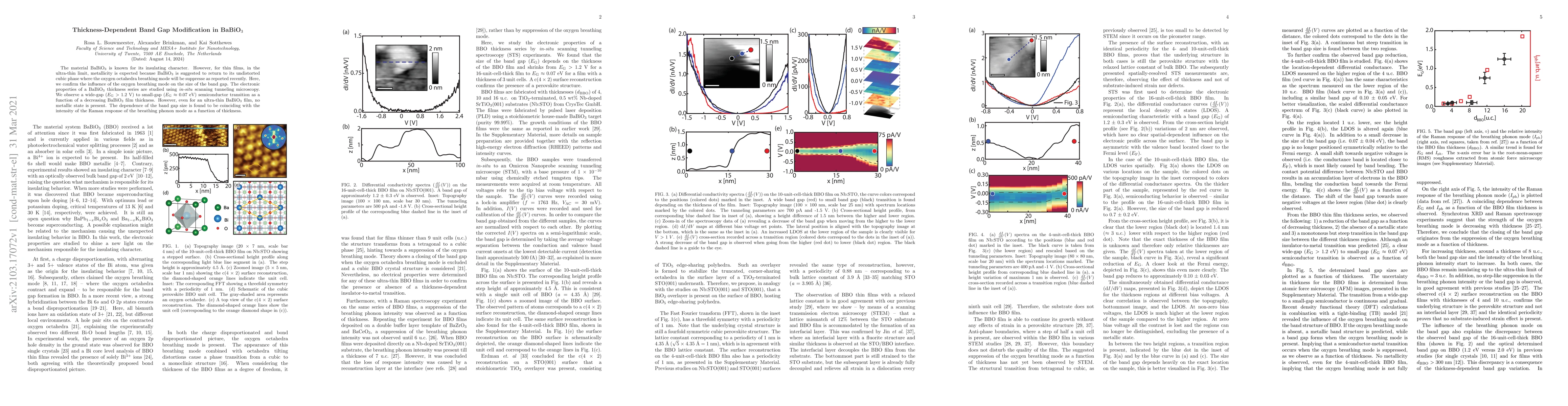 The material BaBiO$_{3}$ is known for its insulating character. However, for thin films, in the ultra-thin limit, metallicity is expected because BaBiO$_{3}$ is suggested to return to its undistorted cubic phase where the oxygen octahedra breathing mode will be suppresse as reported recently. Here, we confirm the influence of the oxygen breathing mode on the size of the band gap. The electronic properties of a BaBiO$_{3}$ thickness series are studied using \textit{in-situ} scanning tunneling microscopy. We observe a wide-gap ($E_\textrm{G}$~$>$ 1.2 V) to small-gap~($E_\textrm{G}$~$\approx$ 0.07 eV) semiconductor transition as a function of a decreasing BaBiO$_{3}$ film thickness. However, even for an ultra-thin BaBiO$_{3}$ film, no metallic state is present. The dependence of the band gap size is found to be coinciding with the intensity of the Raman response of the breathing phonon mode as a function of thickness.