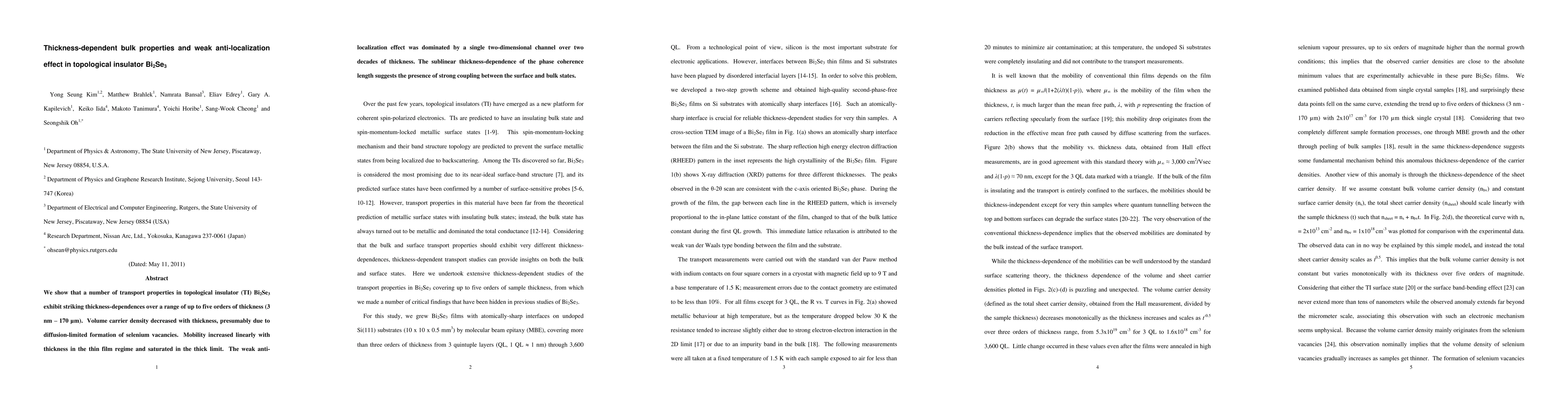 This study reveals significant thickness-dependent transport properties in Bi2Se3 topological insulator, with carrier density decreasing and mobility increasing with thickness. The weak anti-localization effect is primarily influenced by a single two-dimensional channel, indicating strong coupling between surface and bulk states.