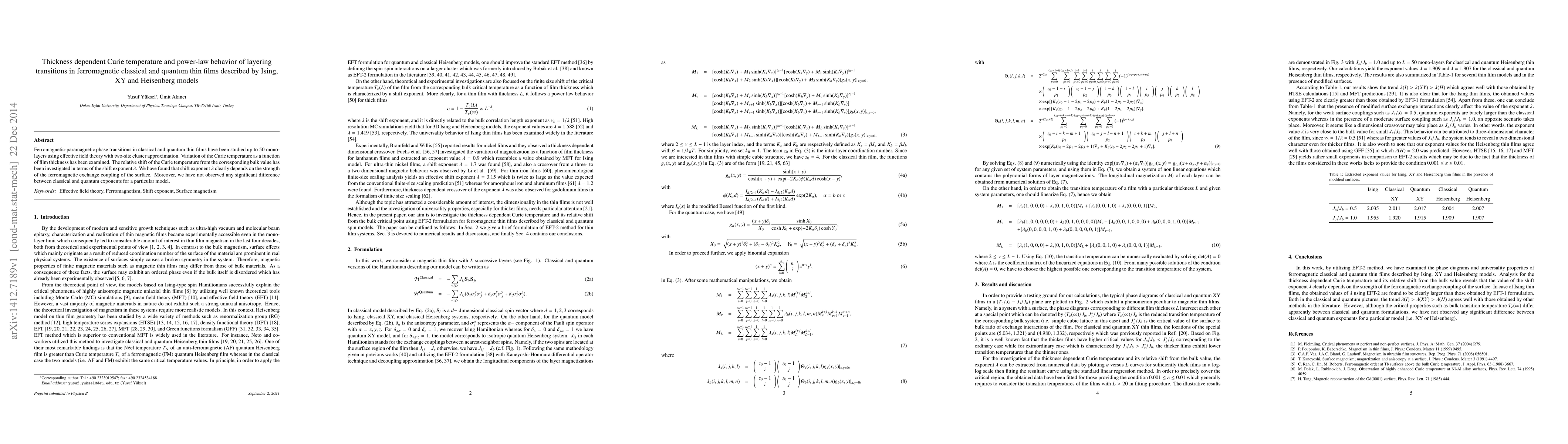 Ferromagnetic-paramagnetic phase transitions in classical and quantum thin films have been studied up to 50 mono-layers using effective field theory with two-site cluster approximation. Variation of the Curie temperature as a function of film thickness has been examined. The relative shift of the Curie temperature from the corresponding bulk value has been investigated in terms of the shift exponent $\lambda$. We have found that shift exponent $\lambda$ clearly depends on the strength of the ferromagnetic exchange coupling of the surface. Moreover, we have not observed any significant difference between classical and quantum exponents for a particular model.