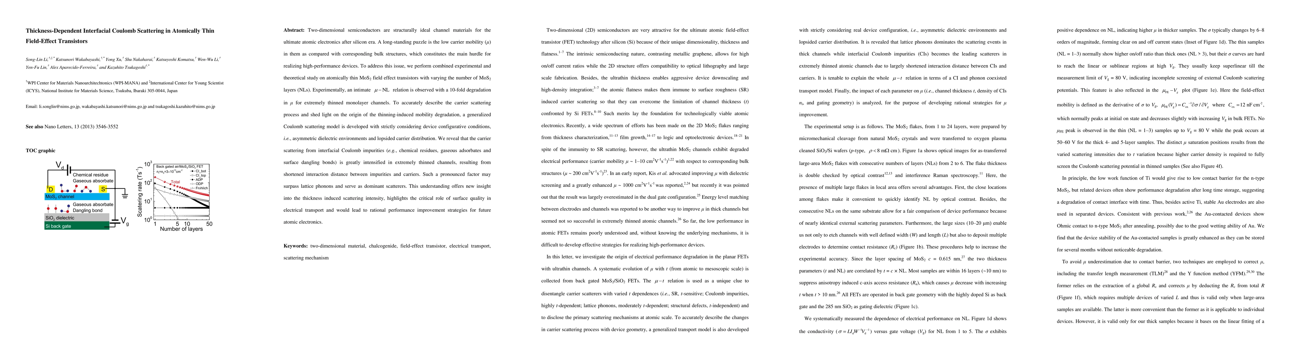 This study investigates the thickness-dependent interfacial Coulomb scattering in atomically thin MoS2 field-effect transistors, revealing a 10-fold degradation in carrier mobility for monolayer channels. The research combines experimental and theoretical approaches to show that interfacial Coulomb impurities dominate scattering in thinned channels, emphasizing the importance of surface quality for future atomic electronics.