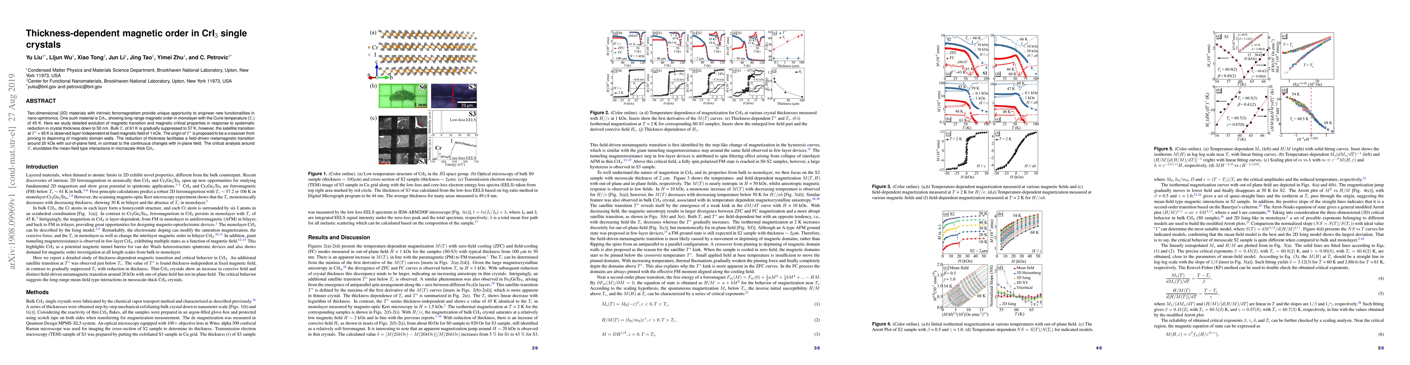 Two-dimensional (2D) materials with intrinsic ferromagnetism provide unique opportunity to engineer new functionalities in nano-spintronics. One such material is CrI$_3$, showing long-range magnetic order in monolayer with the Curie temperature ($T_c$) of 45 K. Here we study detailed evolution of magnetic transition and magnetic critical properties in response to systematic reduction in crystal thickness down to 50 nm. Bulk $T_c$ of 61 K is gradually suppressed to 57 K, however, the satellite transition at $T^*$ = 45 K is observed layer-independent at fixed magnetic field of 1 kOe. The origin of $T^*$ is proposed to be a crossover from pinning to depinning of magnetic domain walls. The reduction of thickness facilitates a field-driven metamagnetic transition around 20 kOe with out-of-plane field, in contrast to the continuous changes with in-plane field. The critical analysis around $T_c$ elucidates the mean-field type interactions in microscale-thick CrI$_3$.