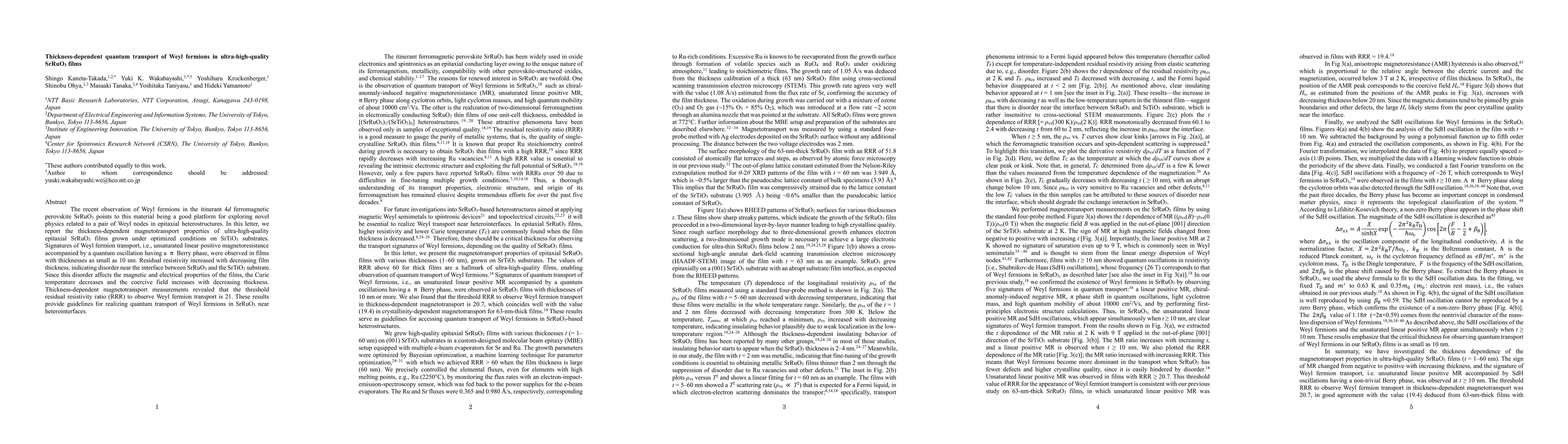 This research reports on the thickness-dependent quantum transport of Weyl fermions in ultra-high-quality SrRuO3 films, observing Weyl fermion signatures in 10 nm films, and identifying a threshold residual resistivity ratio of 21 for their manifestation, while noting interface disorder's impact on magnetic and electrical properties.