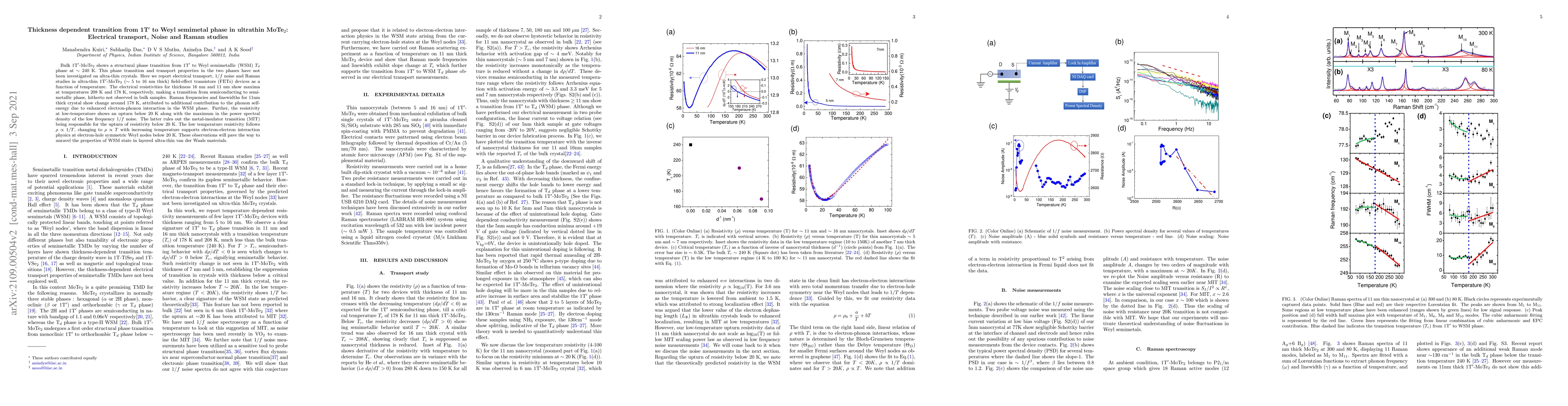 This study investigates the thickness-dependent phase transition in ultrathin MoTe$_2$ from 1T$^\prime$ to Weyl semimetal phase, revealing a transition from semiconducting to semi-metallic behavior at lower temperatures than in bulk samples, and identifying electron-electron interactions at Weyl nodes below 20 K.