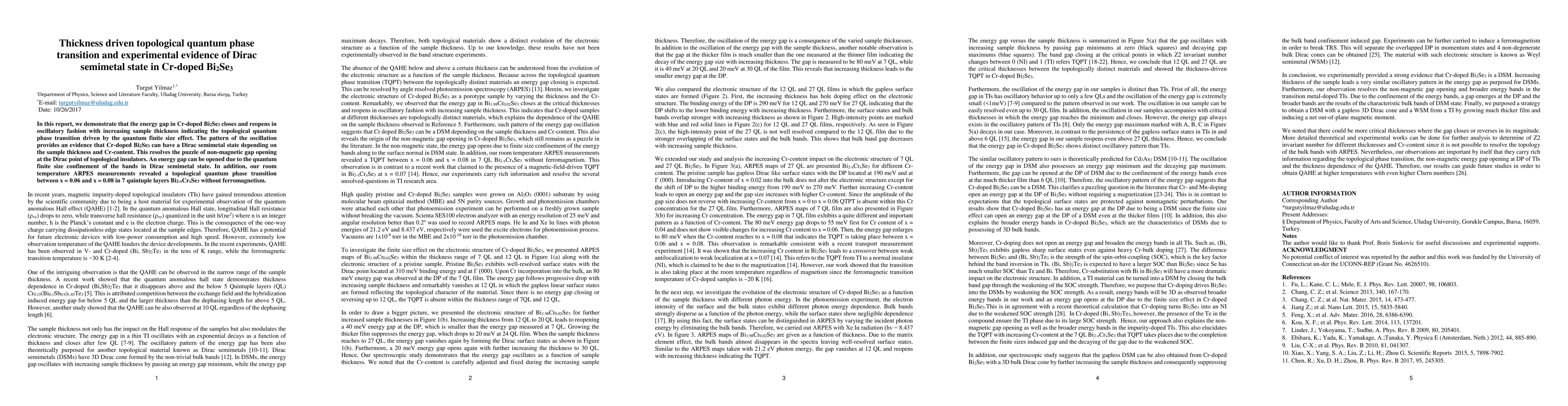 This paper demonstrates a topological quantum phase transition in Cr-doped Bi2Se3, showing that the energy gap oscillates with sample thickness, indicating a Dirac semimetal state. Room temperature ARPES measurements reveal a phase transition without ferromagnetism, resolving the non-magnetic gap opening puzzle in topological insulators.