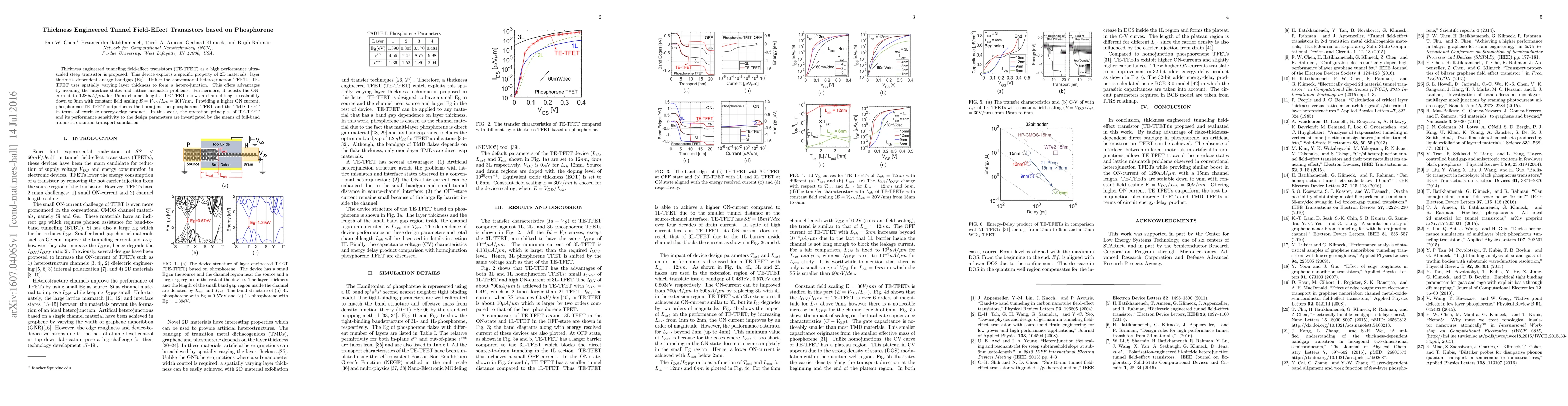 This paper proposes thickness engineered tunneling field-effect transistors (TE-TFET) based on phosphorene, utilizing layer thickness to form a hetero-junction that avoids interface states and lattice mismatch. The device achieves a high ON-current of 1280$\mu A/\mu m$ and demonstrates scalability down to 9nm, outperforming conventional TFETs in energy-delay efficiency.